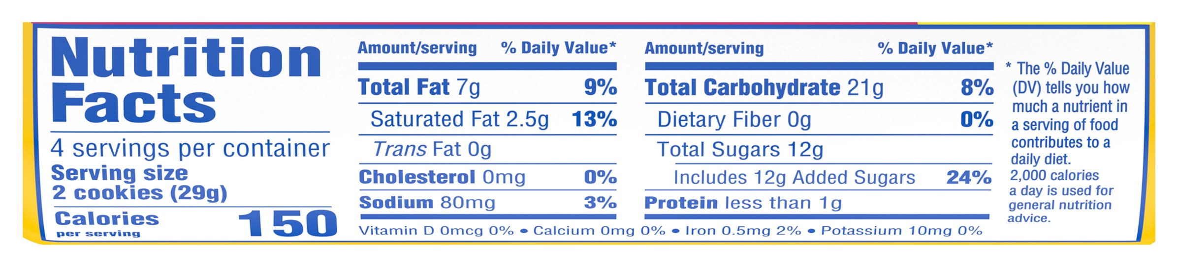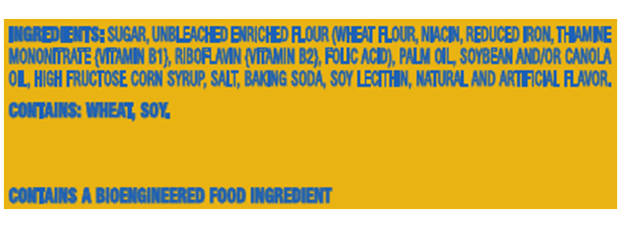 Ingredients: Sugar, Unbleached Enriched Flour (Wheat Flour Niacin Reduced Iron Thiamine Mononitrate {Vitamin B1} Riboflavin {Vitamin B2} Folic Acid), Palm Oil, Soybean and/or Canola Oil, High Fructose Corn Syrup, Salt, Baking Soda, Soy Lecithin, Natural and Artificial Flavor Contains: Wheat, Soybeans, Corn