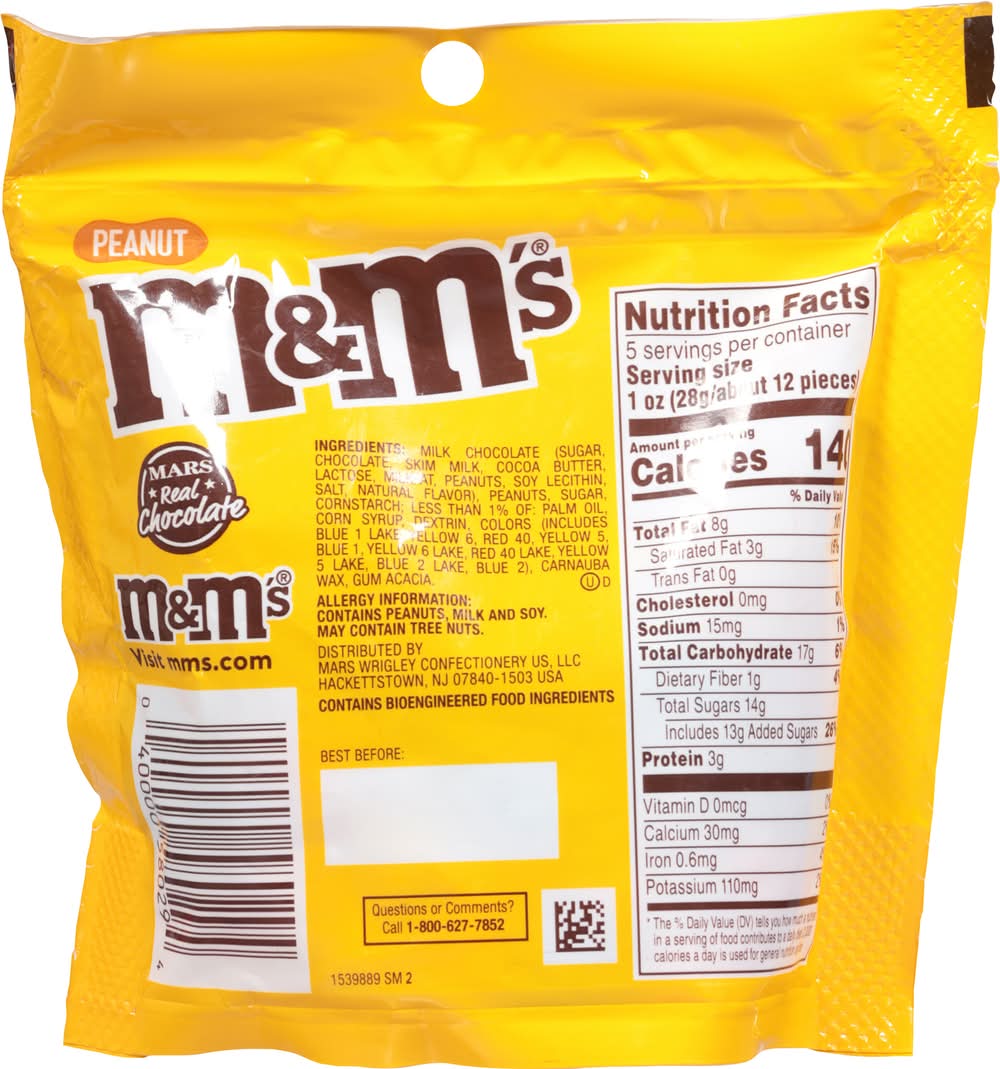 Always on the go can be your new travel buddy. Now in a resealable candy bag, Peanut chocolate candy stays fresh and contained for all of your adventures. Let the flavors of real milk chocolate and roasted peanuts keep you company on your journey, whether you are taking a cross-country road trip or on a 10-mile hike. The car ride home will be much sweeter with this bag of milk chocolates and be sure to save some for later for an after dinner treat. Whether sharing with friends during a game night or passing around to family during a movie night, candy bag of assorted chocolate is the perfect candy to grab.. • Brand: M&m's • Flavor: Peanut • Packaging: Reusable