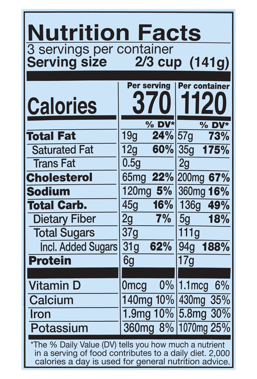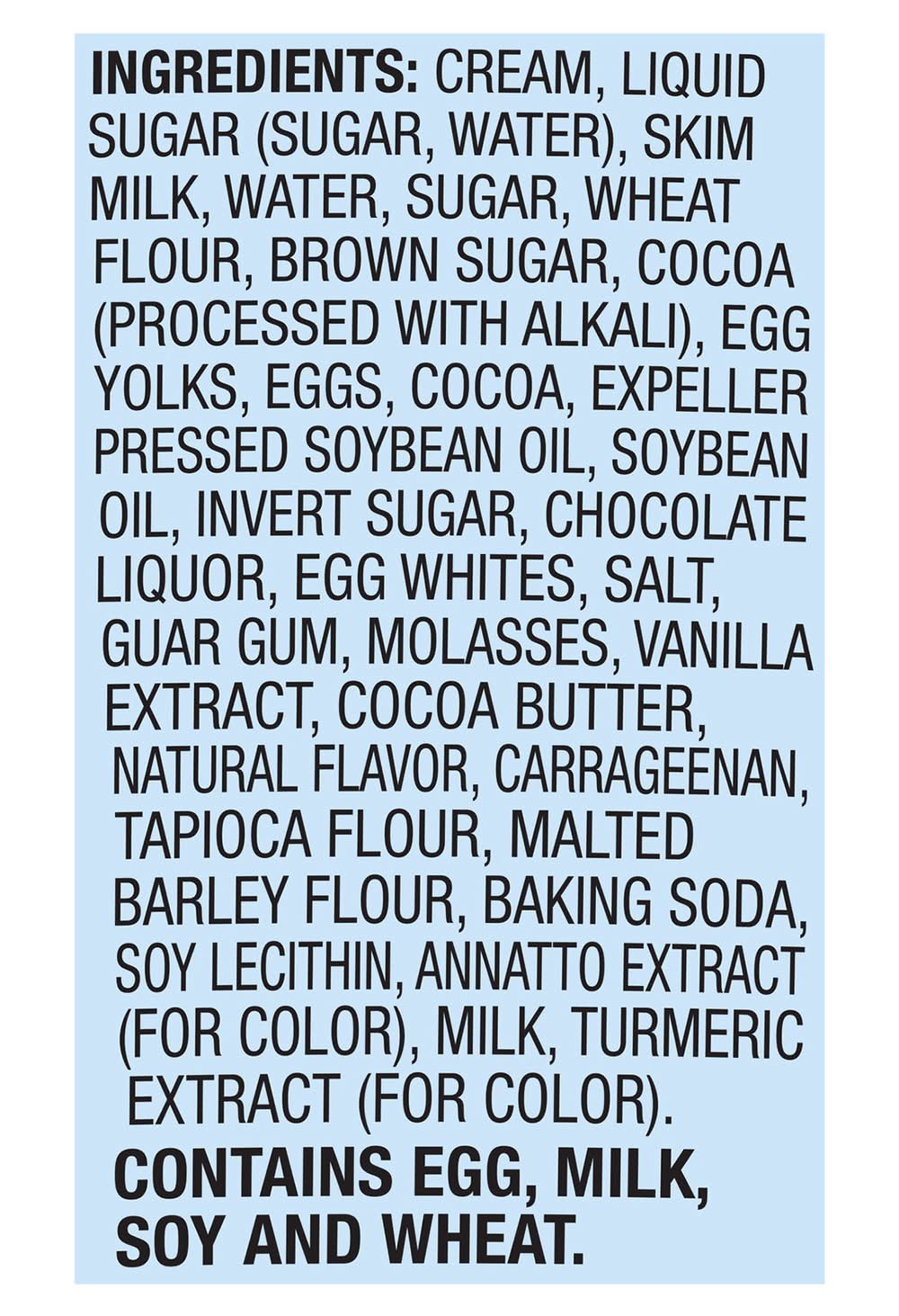 Ingredients: Cream, Liquid Sugar (Sugar, Water), Skim Milk, Water, Sugar, Wheat Flour, Brown Sugar, Cocoa (Processed with Alkali), Egg Yolks, Eggs, Cocoa, Expeller Pressed Soybean Oil, Soybean Oil, Invert Sugar, Chocolate Liquor, Egg Whites, Salt, Guar Gum, Molasses, Vanilla Extract, Cocoa Butter, Natural Flavor, Carrageenan, Tapioca Flour, Malted Barley Flour, Baking Soda, Soy Lecithin, Annatto Extract (for Color), Milk, Turmeric Extract (for Color) Contains: Eggs, Milk, Soybeans, Wheat, Barley