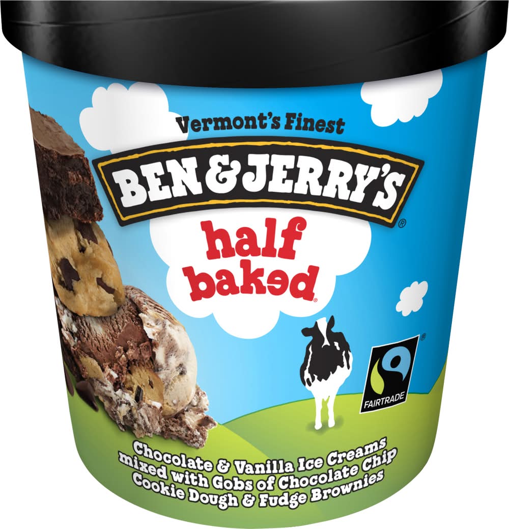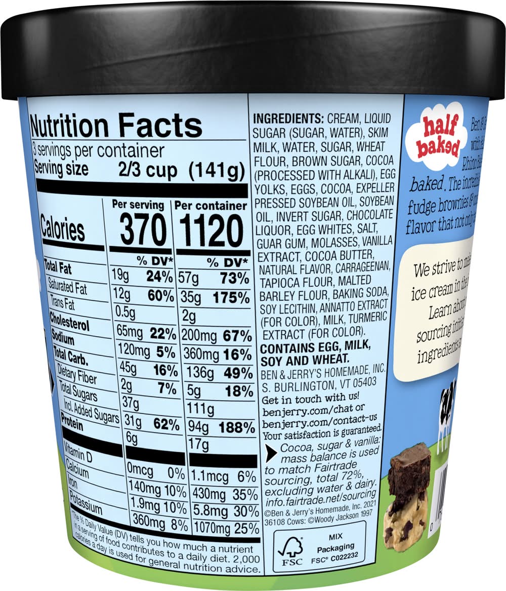 A delectable dance of Chocolate Chip Cookie Dough and Chocolate Fudge Brownie. Vanilla ice cream and chocolate ice cream with chunks of cookie dough and fudge brownies—it’s hard to imagine a better combination. • Brand: Ben & jerry's • Flavor: Half baked • kosher, GMO-free