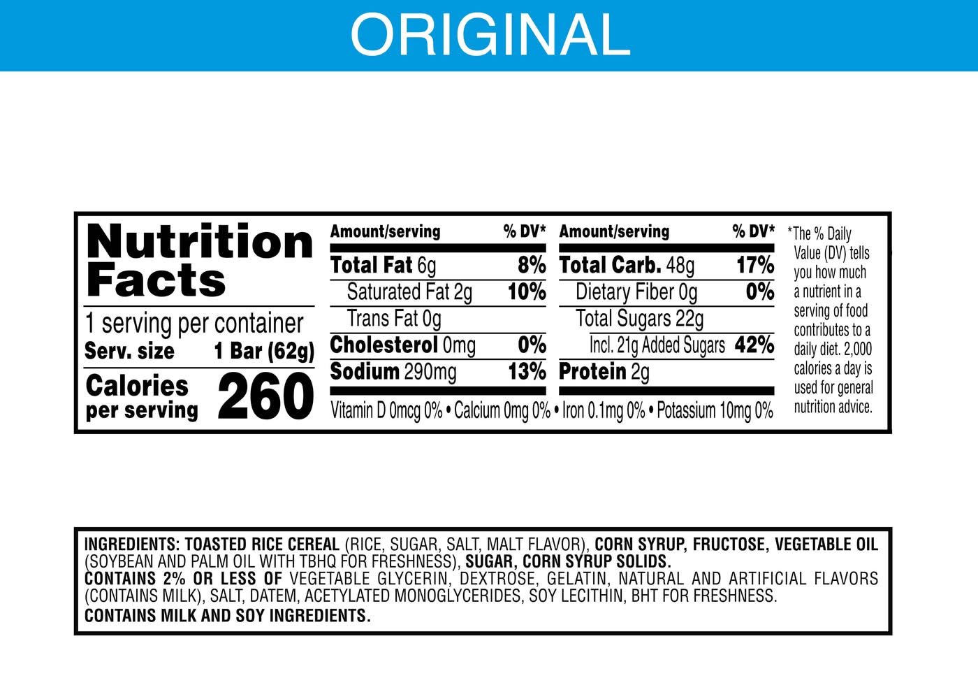 Ingredients: Toasted Rice Cereal (Rice, Sugar, Salt, Malt Flavor), Corn Syrup, Fructose, Vegetable Oil (Soybean and Palm Oil with TBHQ for freshness), Sugar, Corn Syrup Solids, Contains 2% or less of Vegetable Glycerin, Dextrose, Gelatin, Natural and Artificial Flavors (contains Milk), Salt, DATEM, Acetylated Monoglycerides, Soy Lecithin, BHT for freshness Contains: Milk, Soy, Corn
