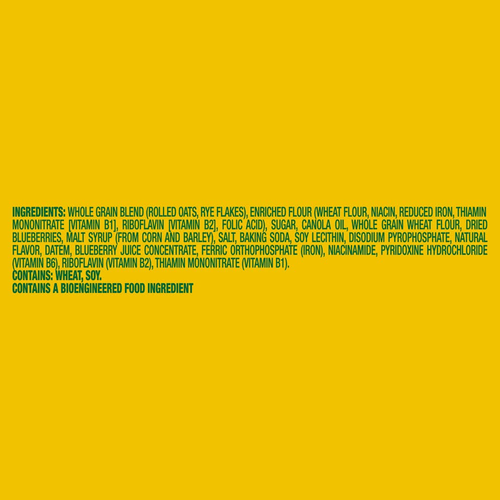 Ingredients: INGREDIENTS: WHOLE GRAIN BLEND (ROLLED OATS, RYE FLAKES), ENRICHED FLOUR (WHEAT FLOUR, NIACIN, REDUCED IRON, THIAMIN MONONITRATE [VITAMIN B1], RIBOFLAVIN [VITAMIN B2], FOLIC ACID), SUGAR, CANOLA OIL, WHOLE GRAIN WHEAT FLOUR, DRIED BLUEBERRIES, MALT SYRUP (FROM CORN AND BARLEY), SALT, BAKING SODA, SOY LECITHIN, DISODIUM PYROPHOSPHATE, NATURAL FLAVOR, DATEM, BLUEBERRY JUICE CONCENTRATE, FERRIC ORTHOPHOSPHATE (IRON), NIACINAMIDE, PYRIDOXINE HYDROCHLORIDE (VITAMIN B6), RIBOFLAVIN (VITAMIN B2), THIAMIN MONONITRATE (VITAMIN B1), .CONTAINS: WHEAT, SOY. Contains: Wheat, Soy