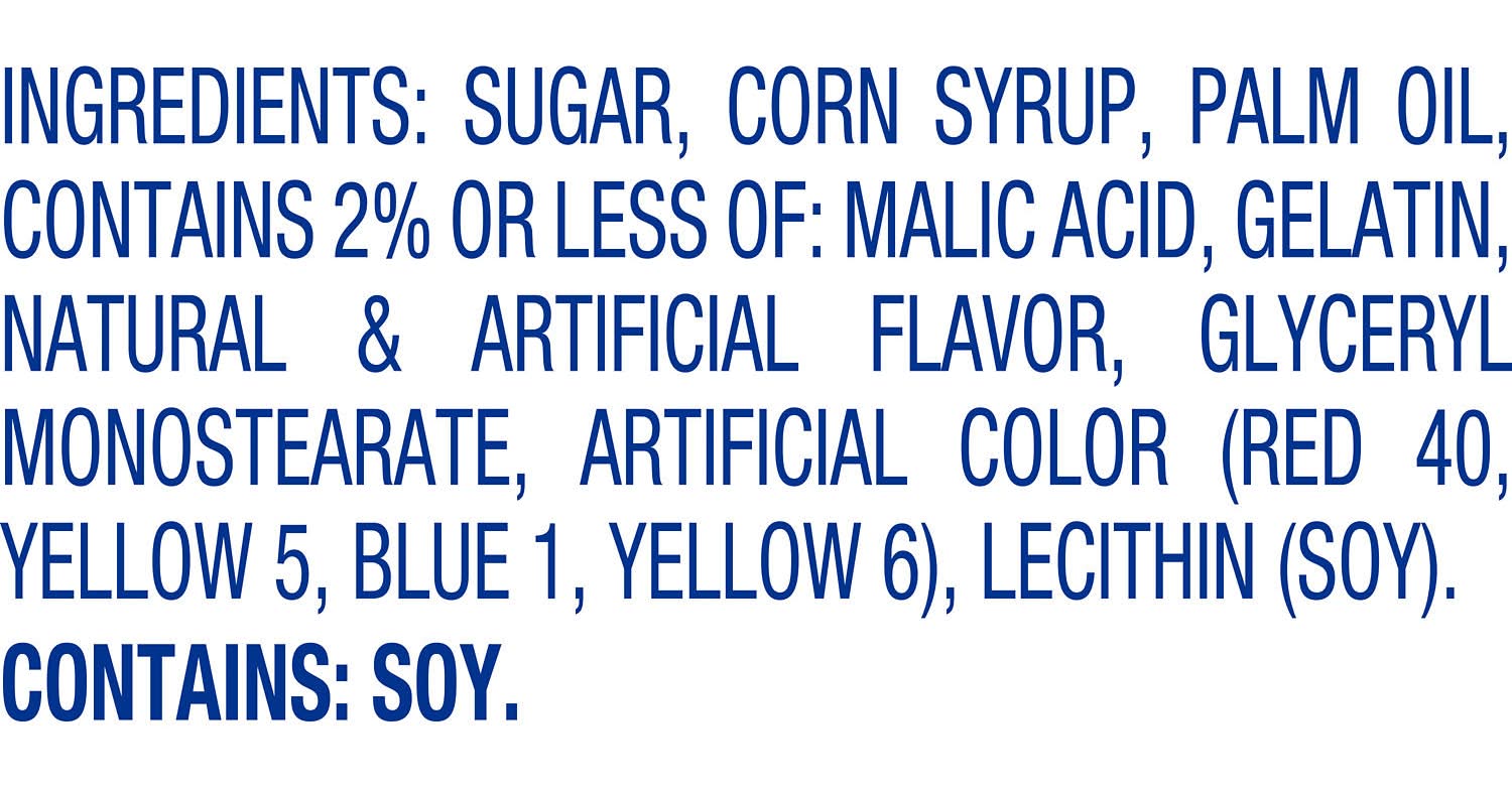 Ingredients: SUGAR, CORN SYRUP, PALM OIL, CONTAINS 2% OR LESS OF: MALIC ACID, GELATIN, NATURAL ARTIFICIAL FLAVOR, GLYCERYL MONOSTEARATE, ARTIFICIAL COLOR (RED 40, YELLOW 5, BLUE 1, YELLOW 6), LECITHIN (SOY), . Contains: Contains: Soy