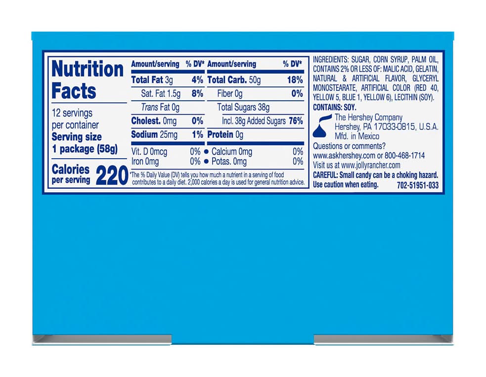 Ready for a chewy candy with five bold, original fruit flavors your family and friends will love? Try JOLLY RANCHER Chews candies. These individually wrapped treats come in a convenient bulk box ready to join you on your daily adventures, from home to the road to work and back home again each day. Perfect for school lunches, work breaks, family celebrations, movie nights and fun celebrations throughout the year, these boxed treats show up to the party in cherry, blue raspberry, green apple, strawberry and watermelon flavors everyone already knows and loves. Looking for fruit flavored candy deliciousness in a chewable treat assortment? Try bulk JOLLY RANCHER Chews candy for celebrating the holidays, too. Stuff festive Christmas stockings, fill Easter baskets and plastic eggs, fill up Halloween trick-or-treat buckets and create Valentine's Day candy gift bags for everyone on your list. And, on ordinary days that could use a little extra color, fill your candy bowls at home and in the office with JOLLY RANCHER Chews sweets in a variety of colors and fruity flavors. You'll have enough to watch family members, friends and co-workers enjoy while still saving some for your own enjoyment on snack breaks and movie nights! • Brand: Jolly rancher • Flavor: Green apple, watermelon, cherry, blue raspberry