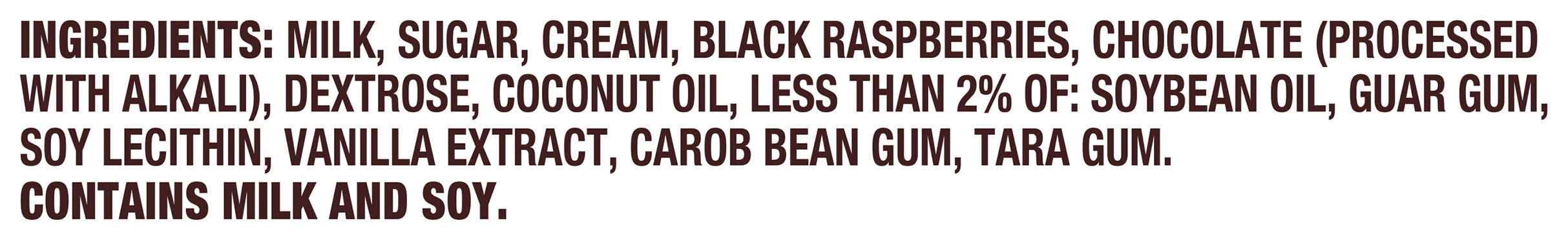 Ingredients: Milk, Sugar (Non-GMO), Cream, Black Raspberries, Chocolate (Processed with Alkali), Dextrose (Non-GMO), Coconut and Soybean (Non-GMO) Oil, Carob Bean Gum, Soy Lecithin, Vanilla Extract, Natural Flavor. Contains: Milk, Soybeans, Tree Nuts, Coconuts