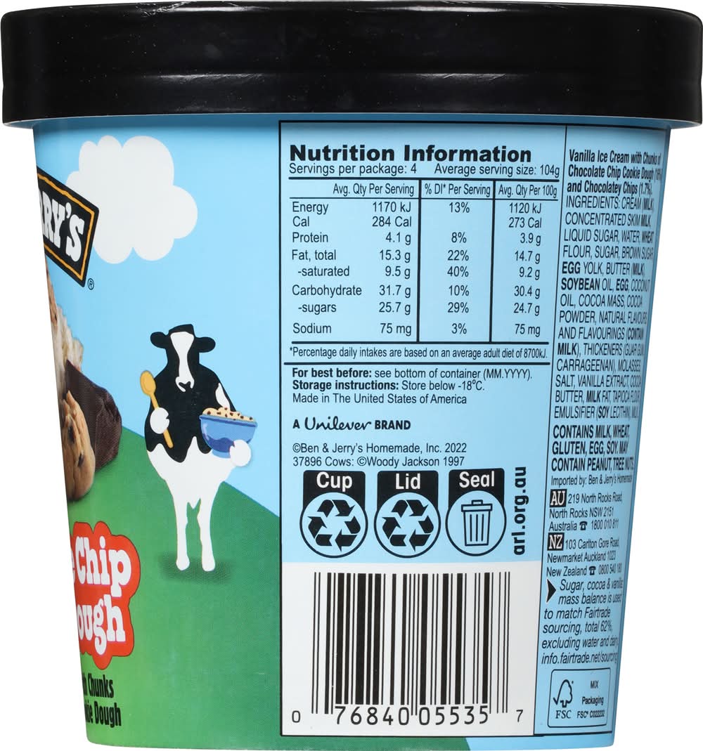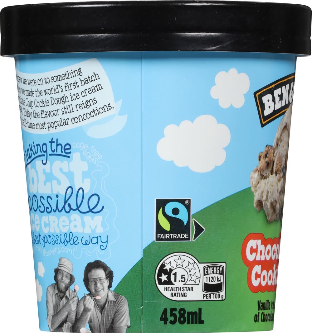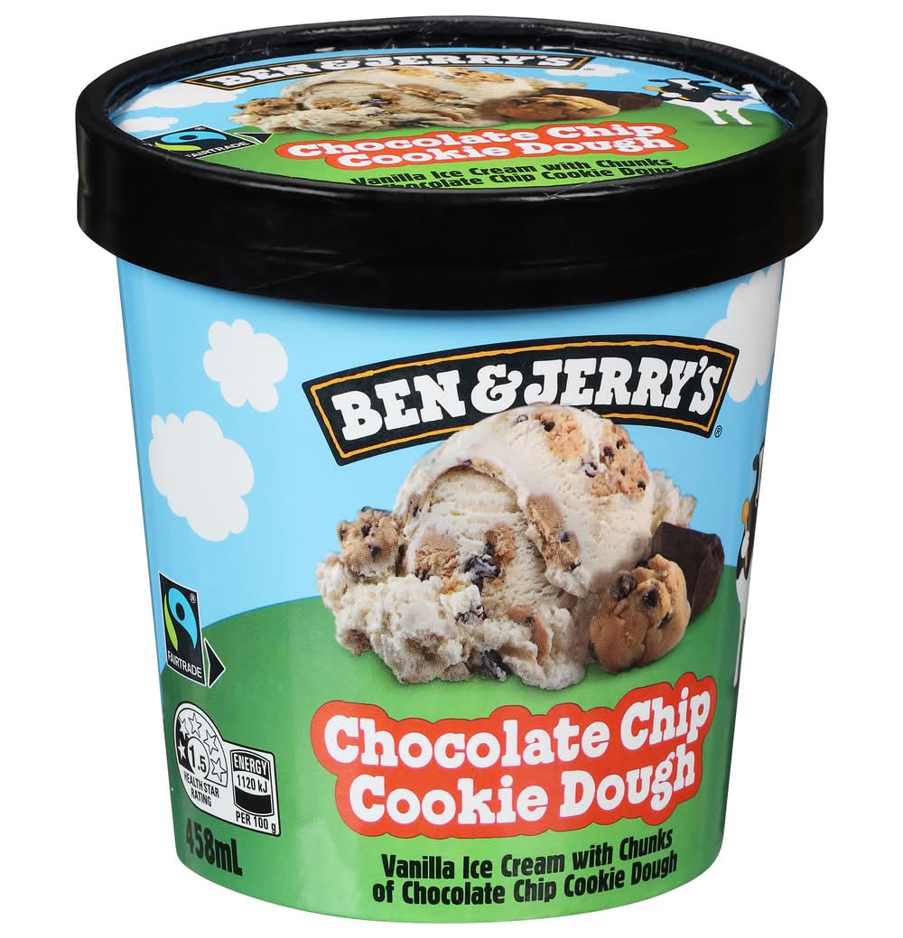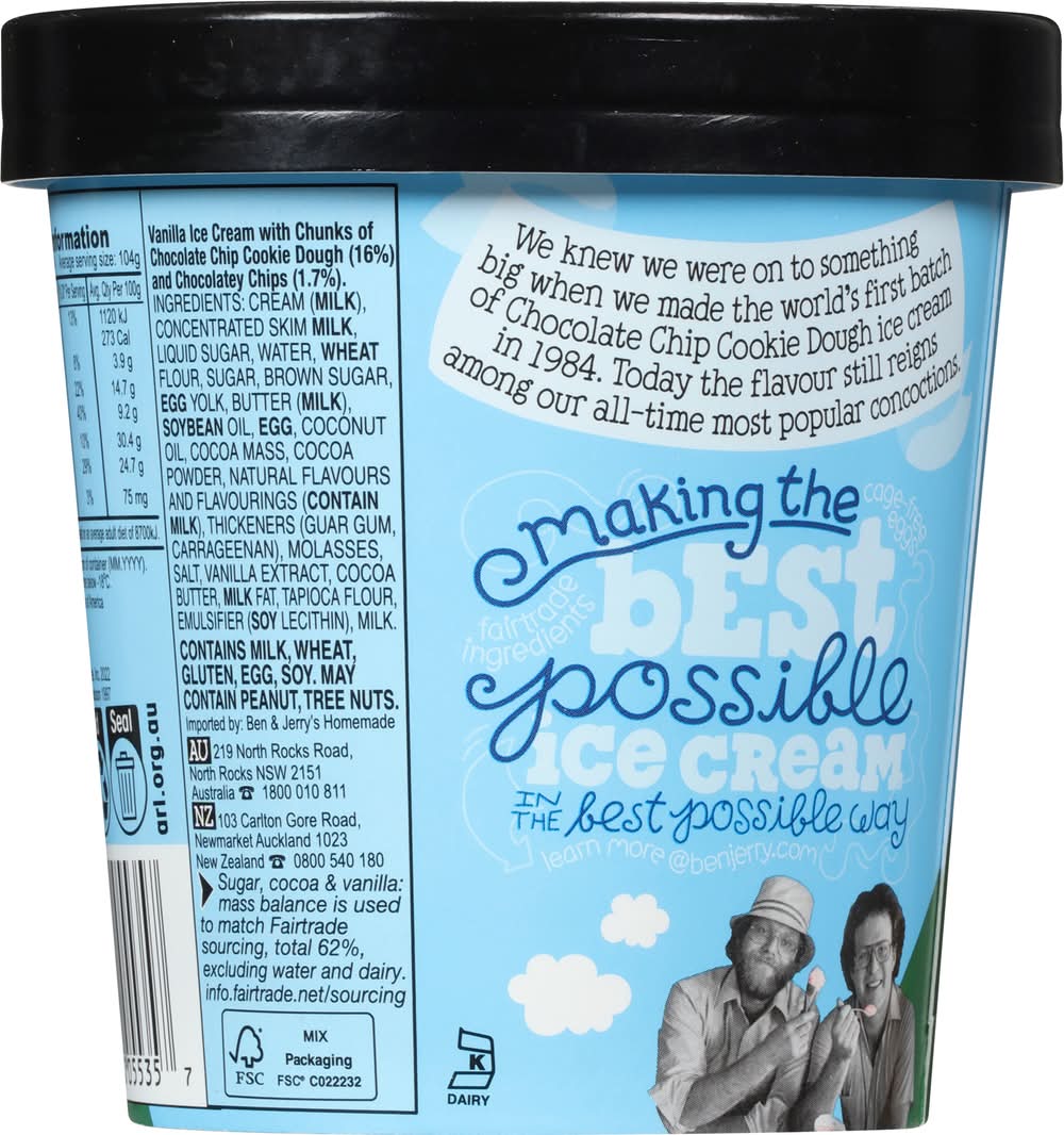 Vanilla ice cream with chunks of chocolate chip cookie dough. Energy 1120 kg per 100 g. 1.5 Health star rating. We knew we were on to something big when we made the world's first batch of chocolate chip cookie dough ice cream in 1984. Today the flavour still reigns among our all-time most popular concoctions. Making the best possible ice cream in the best possible way. • Flavor: Chocolate chip cookie dough • Packaging: Reusable