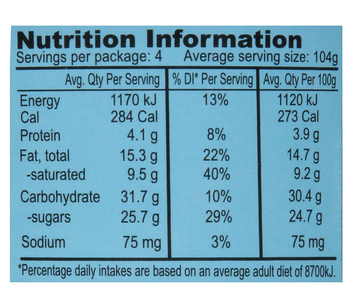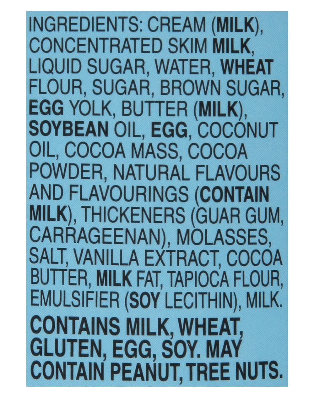 Ingredients: Vanilla Ice Cream with Chunks of Chocolate Chip Cookie Dough (16%) and Chocolatey Chips (1.7%). Cream (Milk), Concentrated Skim Milk, Liquid Sugar, Water, Wheat Flour, Sugar, Brown Sugar, Egg Yolk, Butter (Milk), Soybean Oil, Egg, Coconut Oil, Cocoa Mass, Cocoa Powder, Natural Flavours and Flavourings (Contain Milk), Thickeners (Guar Gum, Carrageenan), Molasses, Salt, Vanilla Extract, Cocoa Butter, Milk Fat, Tapioca Flour, Emulsifier (Soy Lecithin), Milk Contains: Milk, Wheat, Gluten, Eggs, Soybeans, Tree Nuts, Coconuts, Peanuts, Tree Nuts