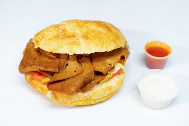 Homemade seitan gyro seasoned with herbs. Served with lettuce, tomato, onions. On the side chips, hot sauce and our white sauce.