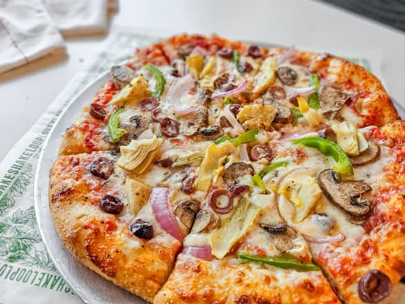 w/mushrooms, greek olives, green peppers, red onions, artichokes & tomato sauce