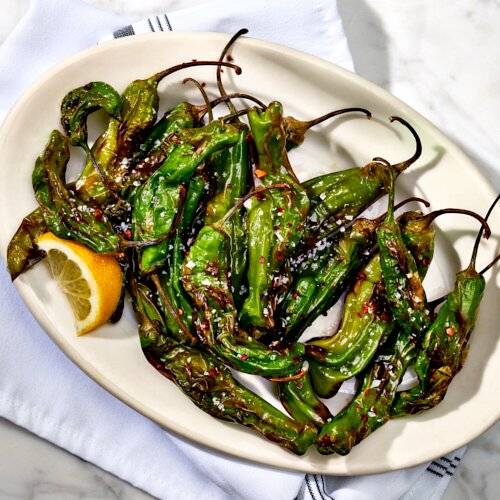 The app the whole table will fight over: blistered shishitos sprinkled with Maldon salt and smoky Aleppo pepper