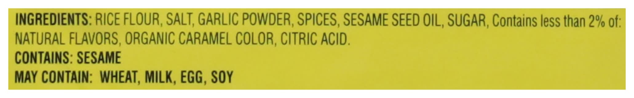 Ingredients: Rice Flour, Salt, Garlic Powder, Spices, Sesame Seed Oil, Sugar, Contains Less than 2% of: Natural Flavors, Organic Caramel Color, Citric Acid Contains: Sesame, Wheat, Milk, Eggs, Soybeans