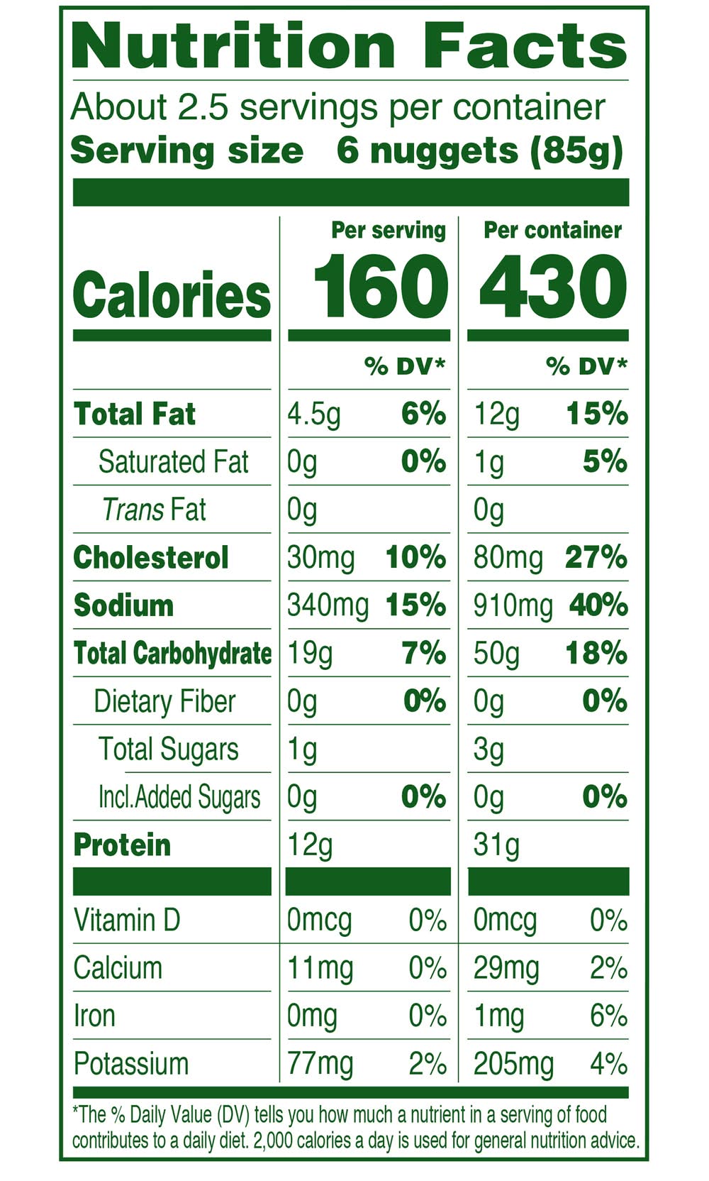 Ingredients: Organic White Meat Chicken**, Water, Organic Rice Flour, Organic Tapioca Starch. Contains Less than 2% of the Following: Organic Corn Starch, Organic Cane Sugar, Sea Salt, Organic Degerminated Yellow Corn Flour, Organic Onion Powder, Organic Garlic Powder, Yeast. Breading Set in Organic Expeller Pressed Canola Oil. **Chicken never administered antibiotics or animal by-products