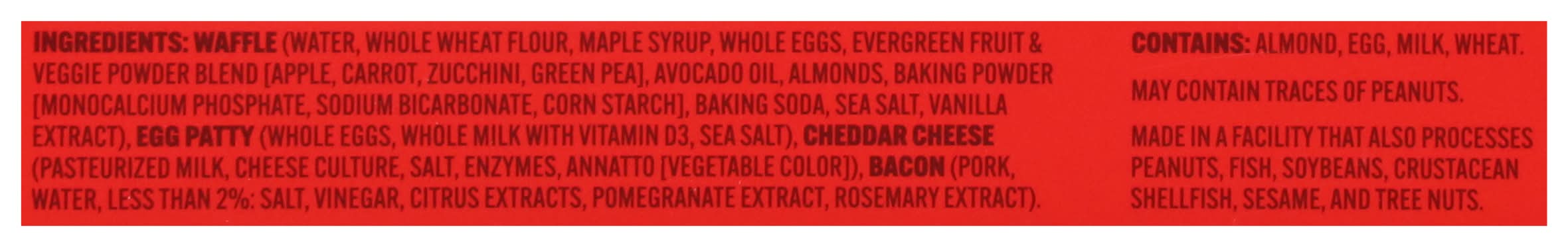 Ingredients: Waffle (Water, Whole Wheat Flour, Maple Syrup, Whole Eggs, Evergreen Fruit & Veggie Powder Blend [Apple, Carrot, Zucchini, Green Pea], Avocado Oil, Almonds, Baking Powder [Monocalcium Phosphate, Sodium Bicarbonate, Corn Starch], Baking Soda, Sea Salt, Vanilla Extract), Egg Patty (Whole Eggs, Whole Milk with Vitamin D3, Sea Salt), Cheddar Cheese (Pasteurized Milk, Cheese Culture, Salt, Enzymes, Annatto [Vegetable Color]), Bacon (Pork, Water, Less than 2%: Salt, Vinegar, Citrus Extracts, Pomegranate Extract, Rosemary Extract) Contains: Tree Nuts, Almonds, Eggs, Milk, Wheat, Corn, Peanuts, Fish, Soybeans, Crustacean Shellfish, Sesame, Tree Nuts