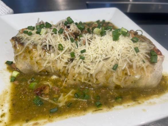 Tender chunks of pork in a green chili sauce, eggs, house potatoes, hack & cheddar cheeses & green onions served in a flour tortilla.