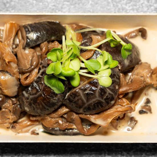 Simmered Shitake mushroom imported from Japan, Simmered Local Organic Oyster Mushroom with cream sauce, truffle oil