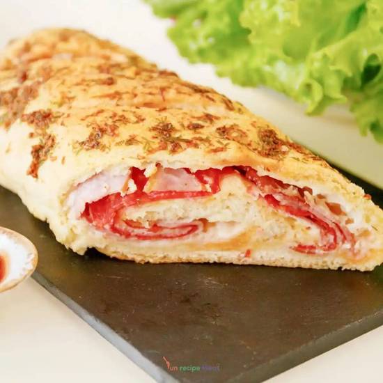 Buffalo sauce chicken with melted mozzarella in a savory Stromboli for a spicy, cheesy delight.