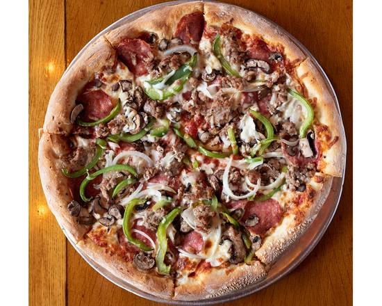 Salami, sausage, mushroom, bell pepper, and onion. Served with tomato sauce and mozzarella cheese.