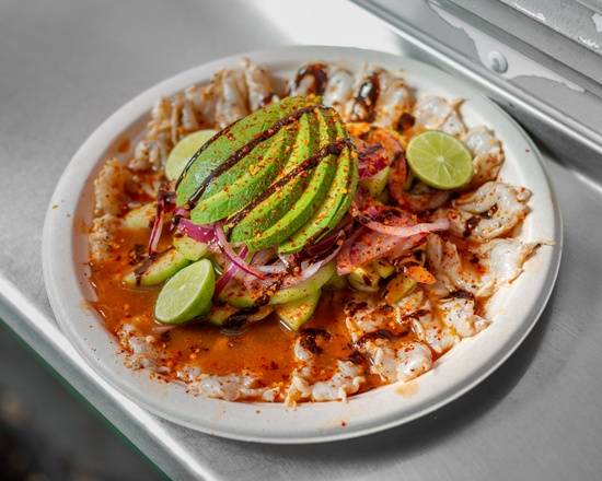 Fresh Mexican dish featuring raw shrimp marinated in lime juice.