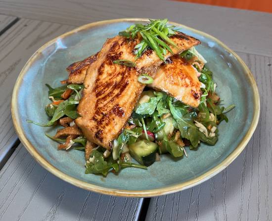 Grilled salmon, arugula, green cabbage, red peppers, cucumbers, crispy wontons, honey-soy vinaigrette