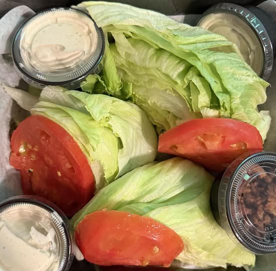 Iceberg lettuce, beefsteak tomatoes, blue cheese, and crumbled bacon.