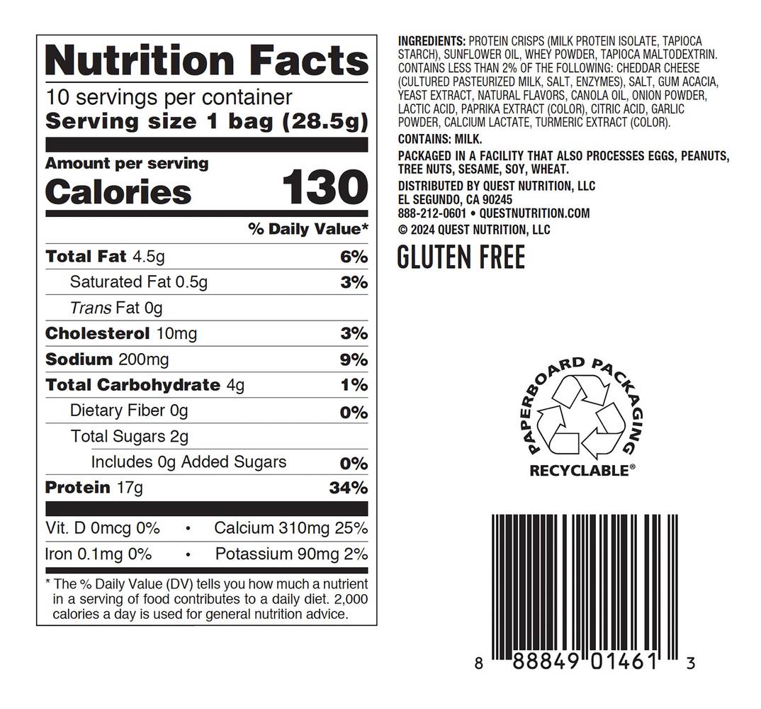 Whats your quest? Ours is to support you with delicious, athlete-worthy nutrition. We use only quality ingredients to give you great-tasting food that isnt packed with sugar and net carbs. So our innovative, protein-forward recipes arent just for athletes to enjoy - theyre for everyone! Its way bigger than a protein puff. Its a Quest. Packaging: Reusable