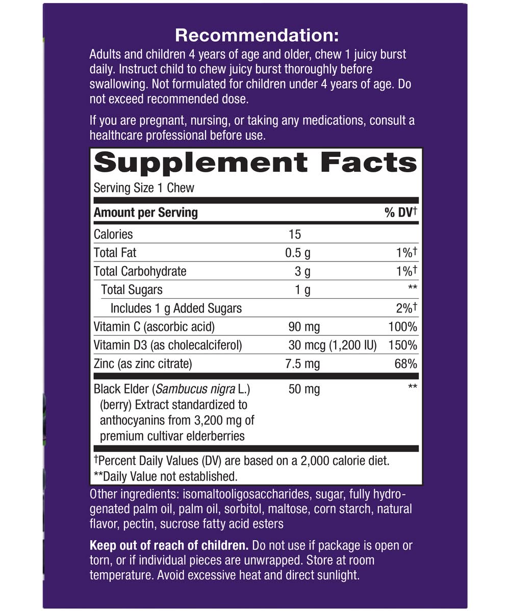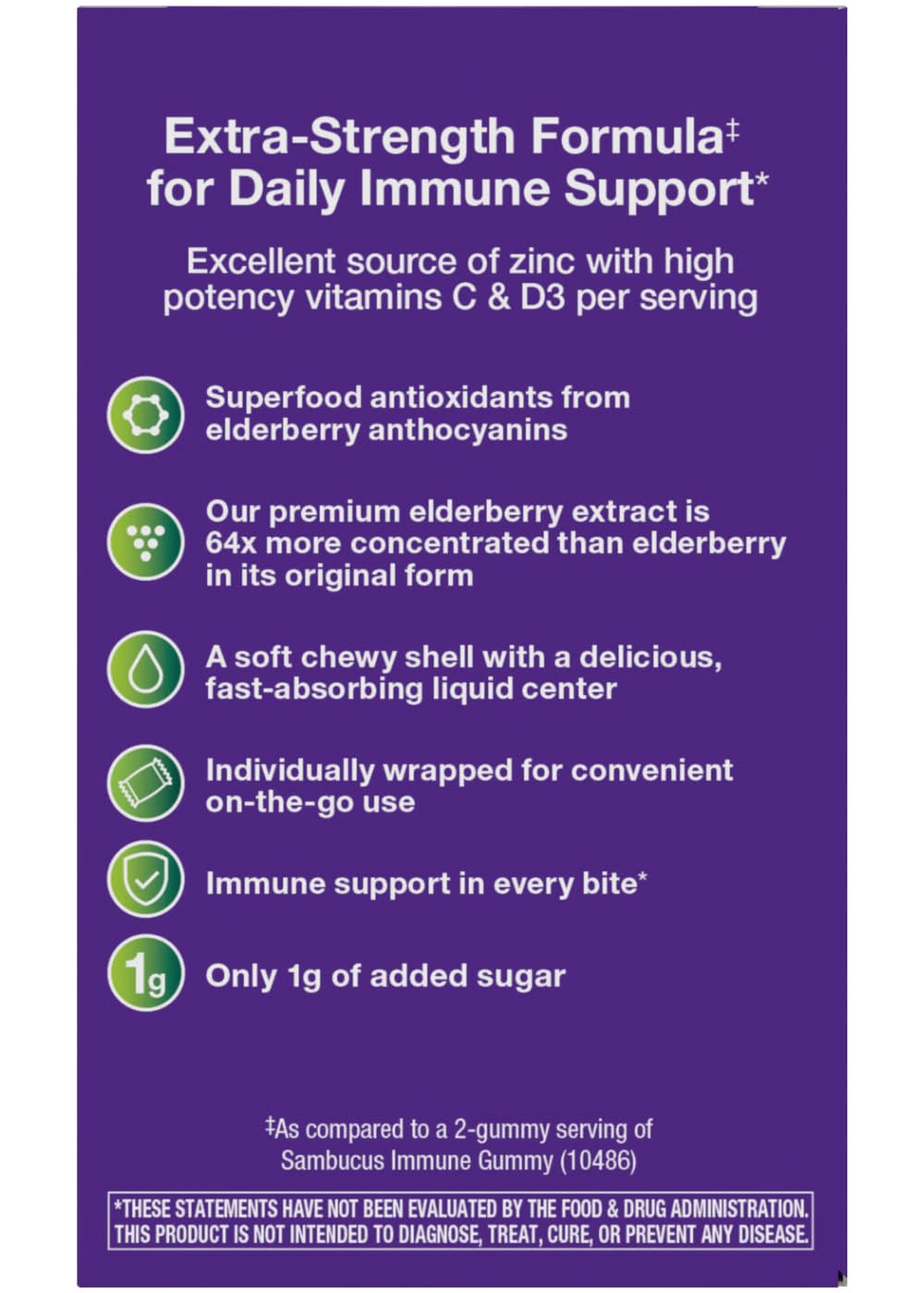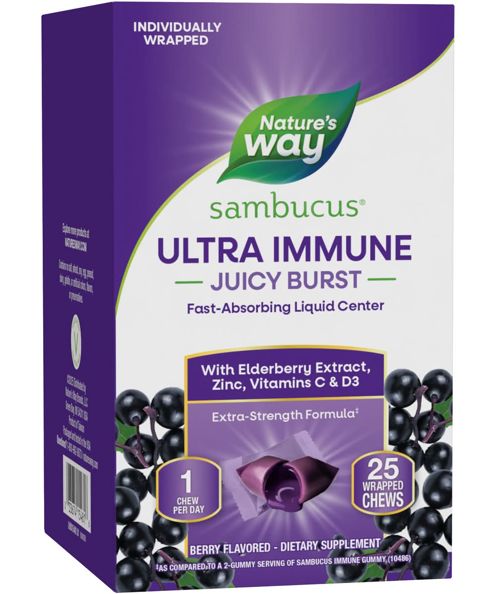 Enjoy a burst of benefits with Natures Way Sambucus Ultra Immune Juicy Burst - an innovative new way to get the daily immune support you want.* Bite into the soft, chewy shell and experience a rush of flavor from the fast-absorbing, berry-flavored liquid center. This extra-strength formula for immune support is made with high potency vitamins C and D3 per serving, an excellent source of zinc per serving, and our premium black elderberry extract, which is 64X more concentrated than elderberry in its original form. Chews are individually wrapped so you can take them everywhere you go. As compared to 2-gummy serving of Sambucus Elderberry Immune Gummy (10486).