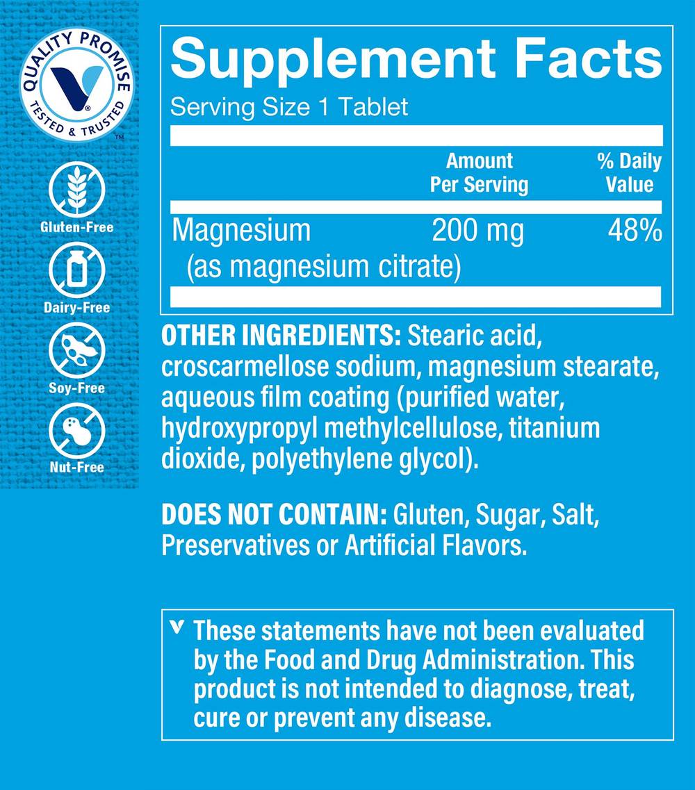Supports energy productionPromotes regularitySuitable for everyday wellness seekersFree of gluten, dairy, soy, nuts, sugar, salt, preservatives, and artificial flavors Did you know that magnesium comes in a variety of different forms? Magnesium Citrate is a form of magnesium that's bonded to citric acid for easier absorption into the body. It's great for promoting regularity-perfect for those experiencing occasional constipation-and energy production to combat fatigue. The Vitamin Shoppe® brand Magnesium Citrate tablets contain 200mg of this essential mineral per serving to keep you and your GI tract running smoothly throughout the day.