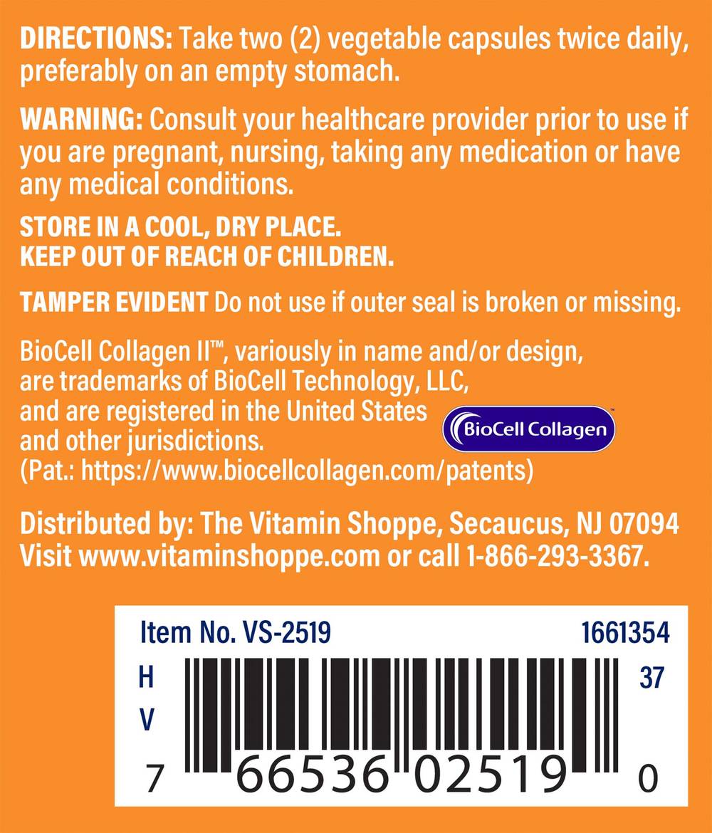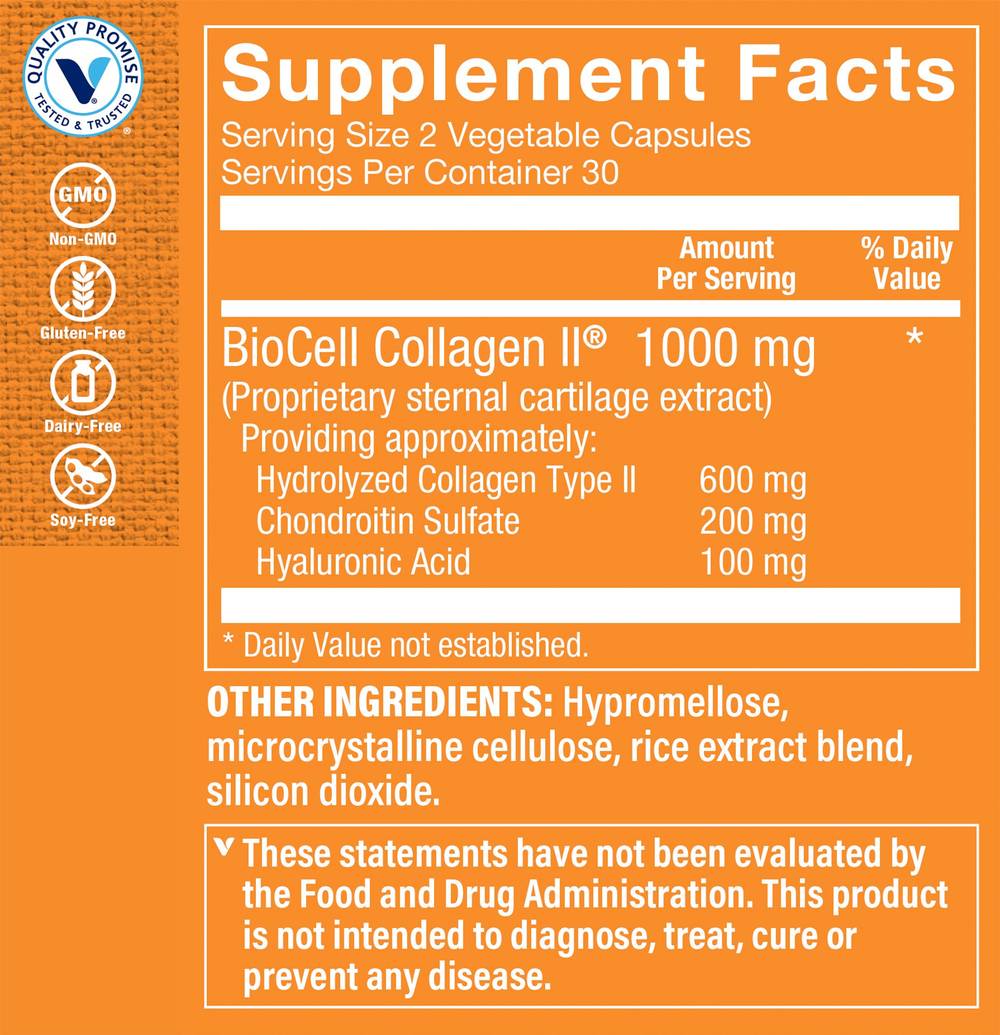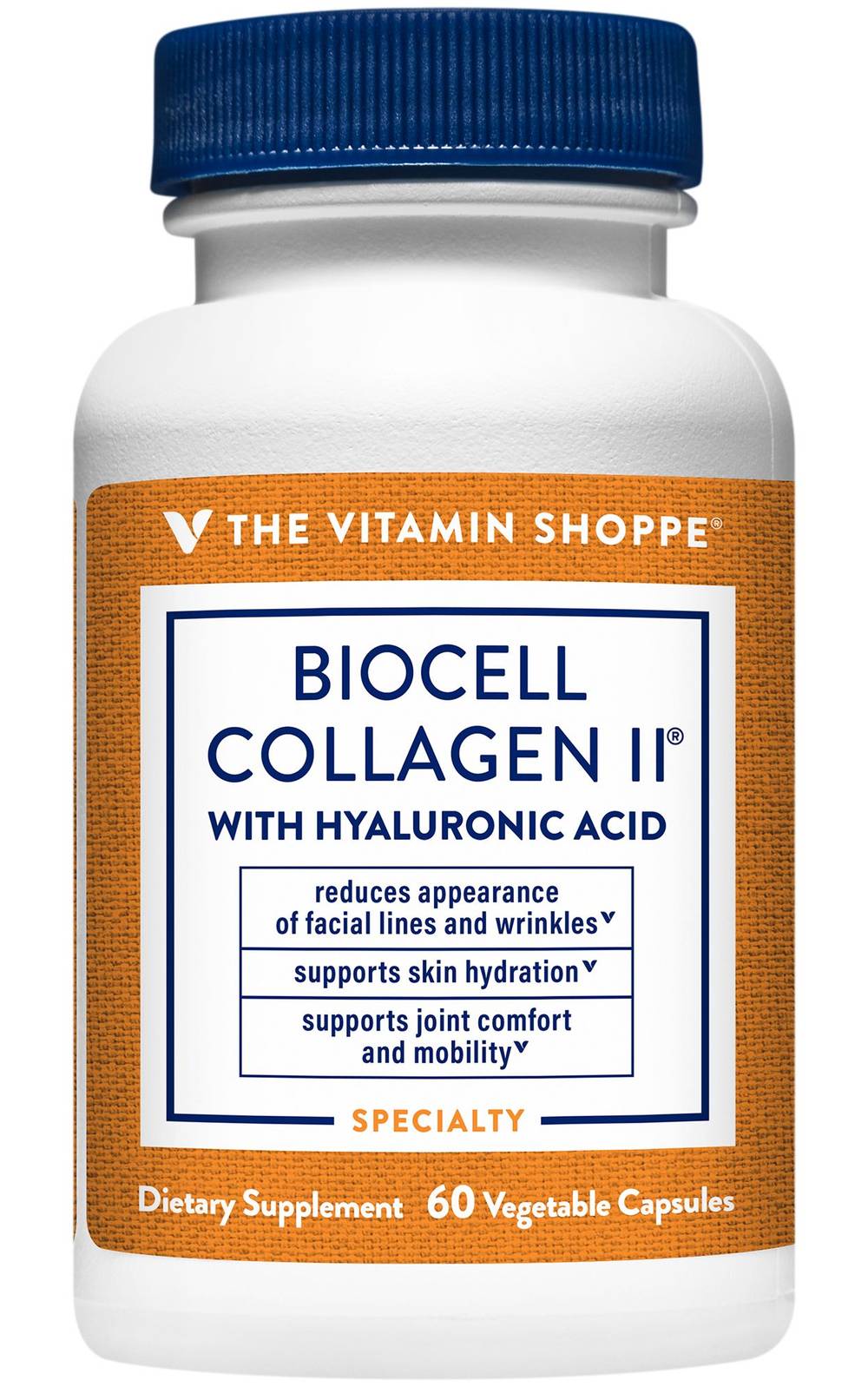 Reduces the appearance of fine lines and wrinkles Supports skin hydration Promotes joint comfort and mobility Non-GMO and free of gluten, dairy, and soy Maintain a springy step and youthful glow with BioCell Collagen II� from The Vitamin Shoppe� brand. This non-GMO formula supports strong joints with hydrolyzed collagen type II and chondroitin sulfate, and promotes firm and supple skin with hyaluronic acid.