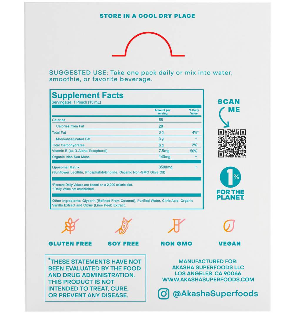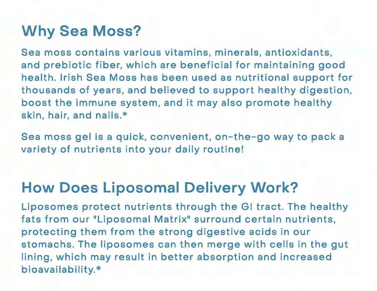 Our single-serve liposomal sea moss gel packets are loaded with vitamins, minerals, antioxidants, and prebiotic fiber to help improve digestion, skin health, and overall energy levels. Sustainably sourced ingredients and 3rd party lab testing ensures we have the highest quality and most trusted sea moss gel on the market.
