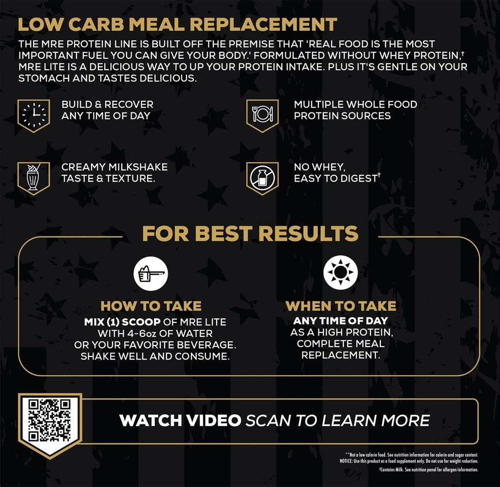 Many in stockFuel your body with the power of real food. MRE LITE is a high-quality, low-carb protein powder designed to give you the nutrition you need without the extra calories or carbs. MRE LITE is formulated without whey protein, offering 26g of high-quality protein per serving with an ideal macronutrient profile for post-workout recovery or anytime you need an extra protein boost. Unlike typical whey-based protein powders, MRE Lite delivers a rich, milkshake-like texture that mixes easily and tastes incredible. Its non-whey formula is gentle on your stomach, easy to digest, and eliminates the bloating often associated with whey protein.