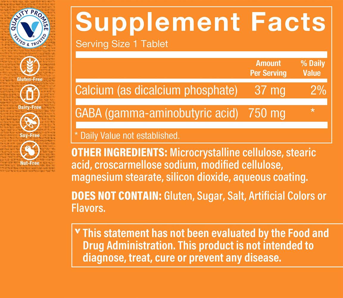 Supports relaxation and mental focus Suitable for everyday wellness seekers Free of gluten, dairy, soy, nuts, sugar, salt, and artificial colors or flavors The Vitamin Shoppe� brand GABA tablets can help you manage stress while supporting relaxation and mental focus. When the brain feels threatened, it releases stress-inducing hormones such as cortisol and adrenaline. GABA, or gamma-aminobutyric acid, is a naturally occurring chemical in the brain that helps combat these stress stimulants. These convenient once-daily tablets help make striving for balanced wellness easybecause a healthy mind is just as important as a healthy body.