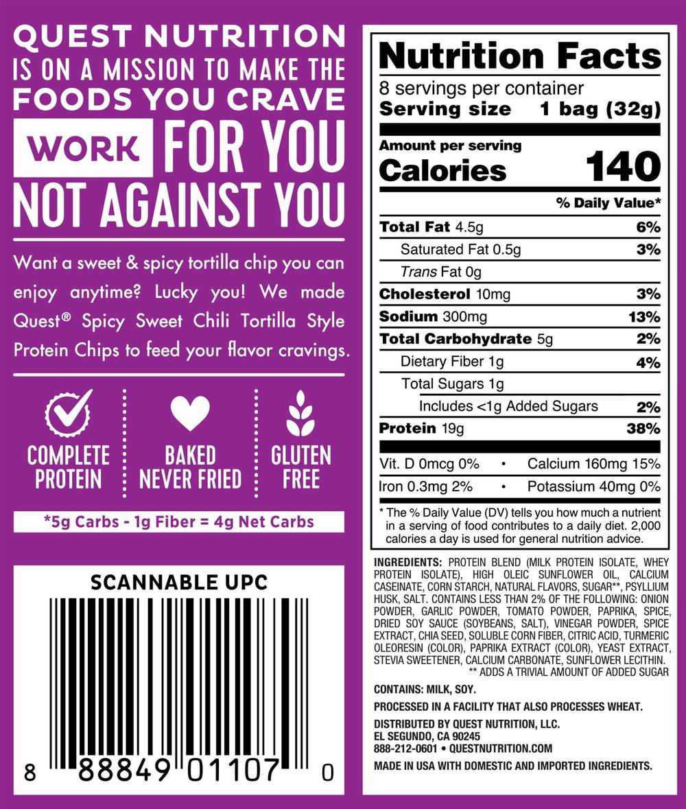 Quest Nutrition is on a mission to make the foods you crave work for you not against you.Want a sweet & spicy tortilla chip you can enjoy anytime? Lucky you! We made Quest Spicy Sweet Chili Tortilla Style Protein Chips to feed your flavor cravings.