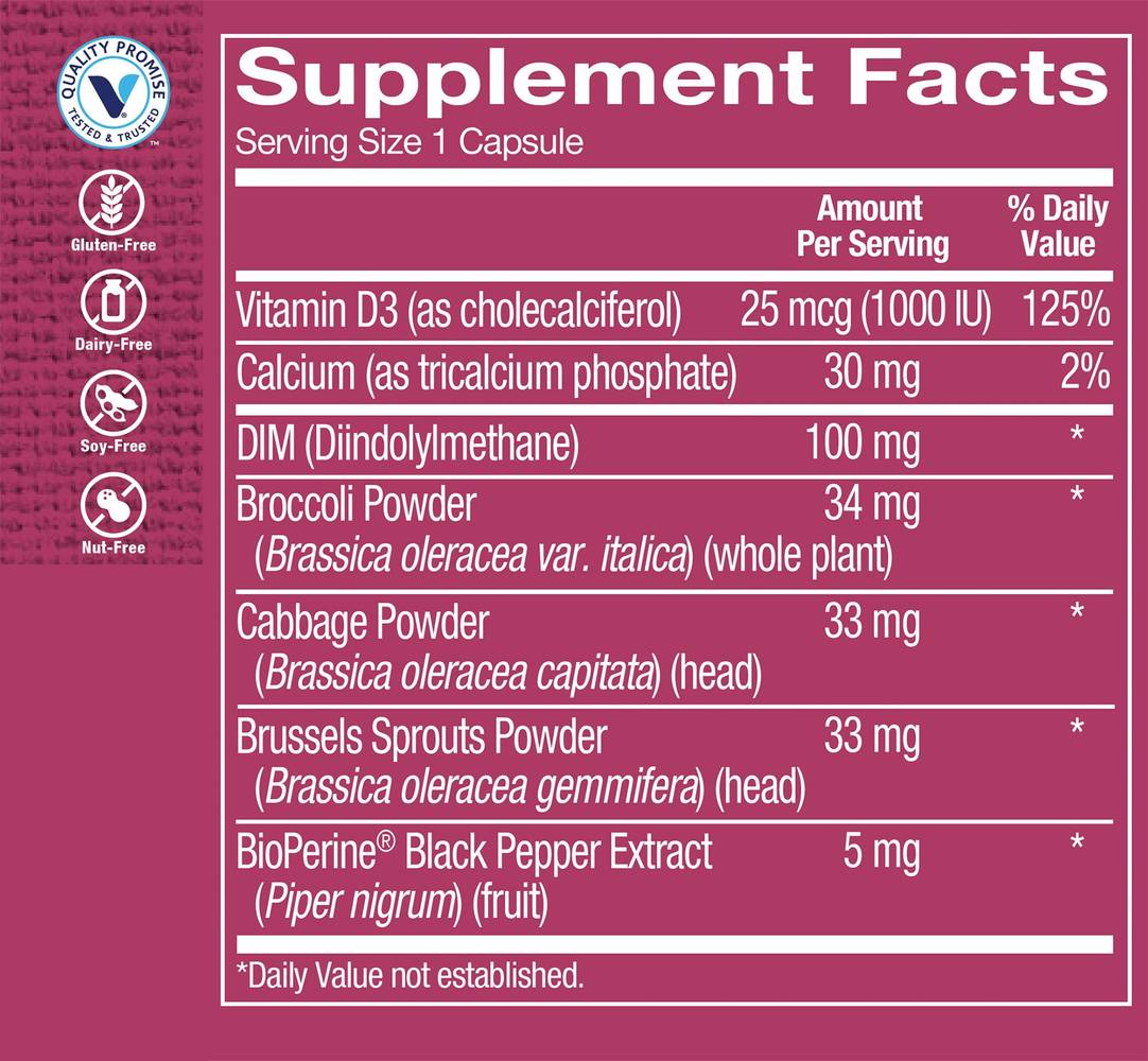 Supports estrogen metabolism 5mg of BioPerine� per serving Free of gluten, dairy, soy, and nuts DIMshort for diindolylmethaneis a plant compound found in cruciferous vegetables like broccoli, cabbage, and Brussels sprouts. Particularly important for women's wellness, DIM promotes a healthy estrogen balance by increasing "good" estrogen metabolites and reducing "bad" estrogen metabolites. If you're having trouble filling your plate with enough green veggies, try supplementing with The Vitamin Shoppe� brand DIM to support a healthy hormone balance. Frequently Asked Questions What is BioPerine? BioPerine is a patented black pepper extract that is used to support the absorption of nutrients.