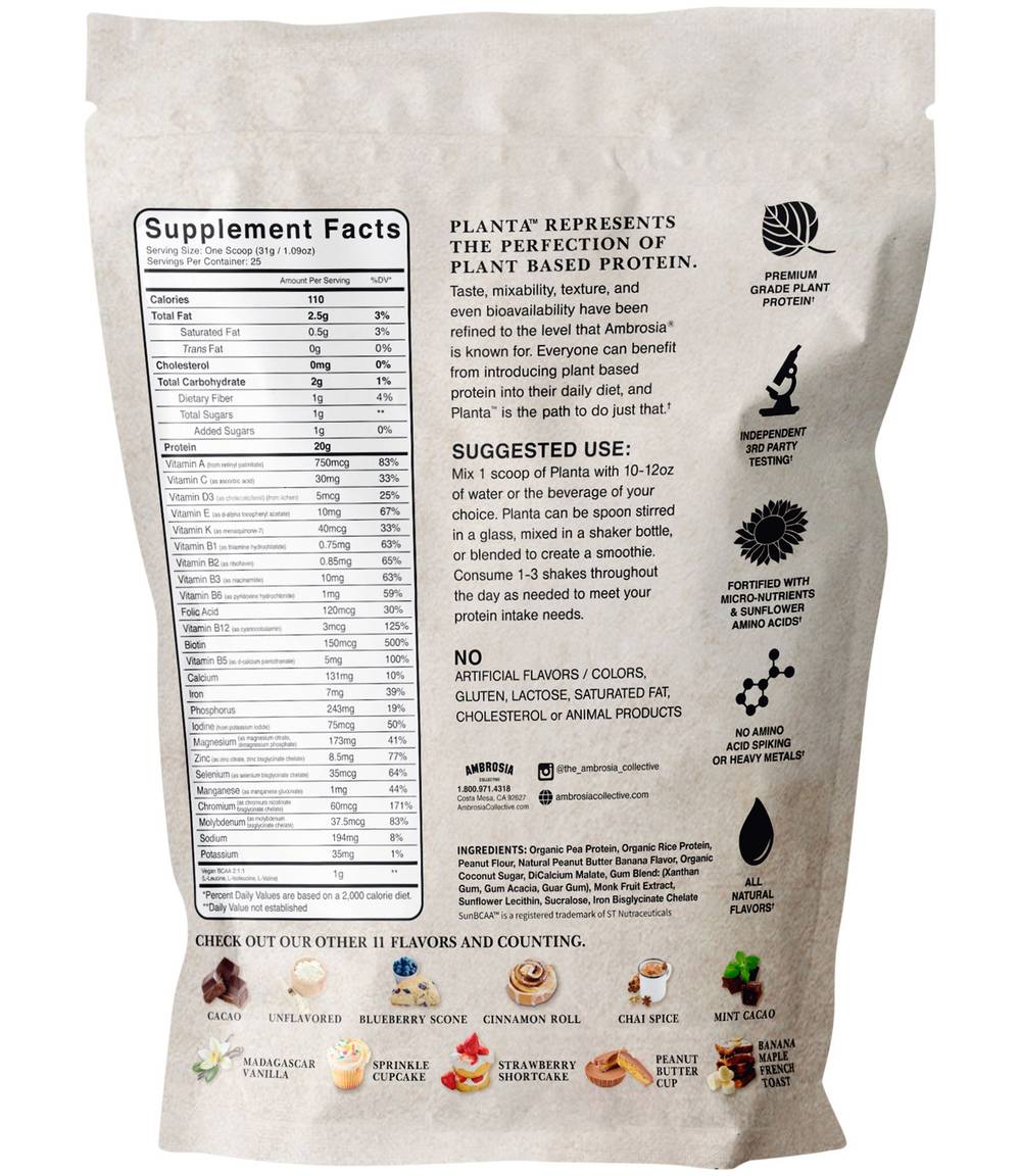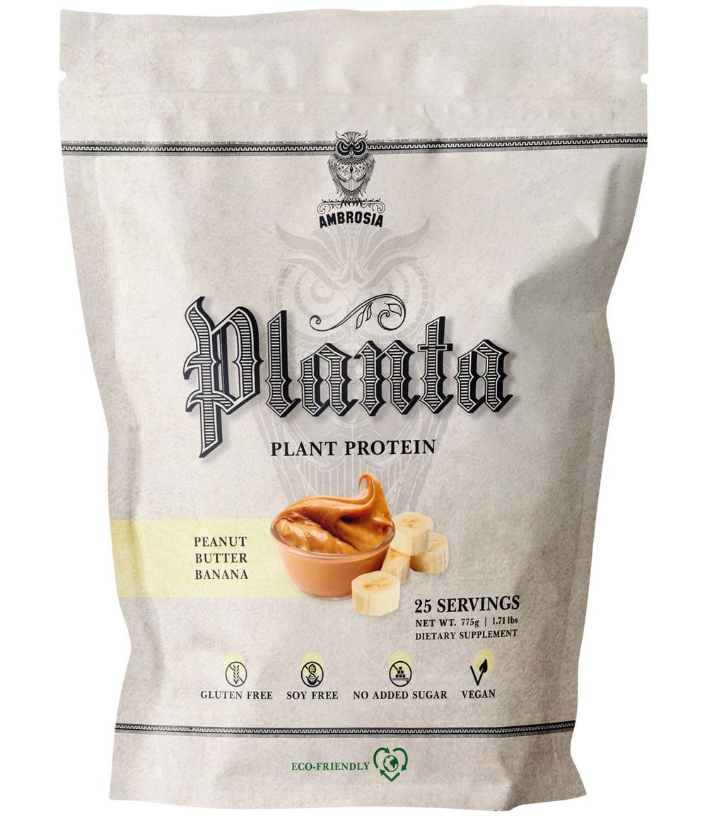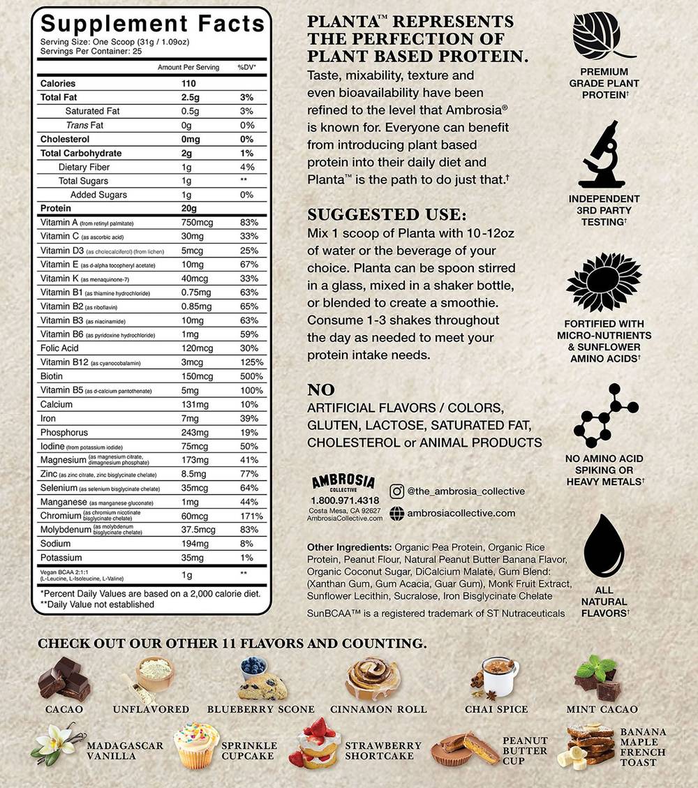 Supports muscle growth and recovery Vegan Free of gluten, soy, lactose, added sugar, and artificial flavors or colors Peanut Butter Banana flavor Planta Plant Protein by Ambrosia Collective is perfect for those with an active lifestyle or anyone trying to get more protein in their diet. Crafted from organic rice and pea proteins, this delicious vegan formula delivers SunBCAA amino acids at a full 2:1:1 ratio, 20g of protein, 27 vitamins and minerals, and 110 calories per serving. Frequently Asked Questions What does it mean to have a 2:1:1 BCAA ratio? A 2:1:1 BCAA ratio indicates that a supplement has 2 parts leucine for every part isoleucine and valine. This ratio has been shown to support muscle protein synthesis, increase energy, and reduce exerc