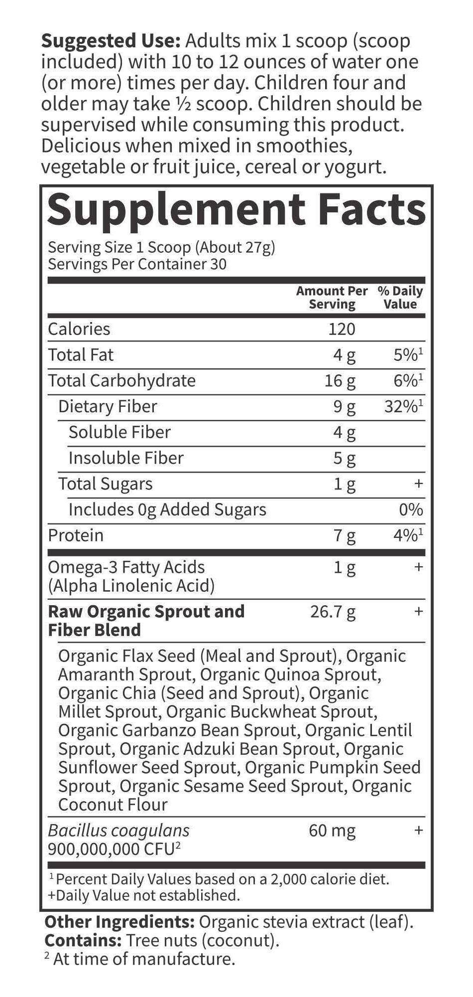 Raw Organic Fiber powder supports bowel regularity and elimination of toxins, providing 9g of fiber per serving (32% DV) along with 7 grams of protein, probiotics, and Omega 3 fatty acids for overall health Our Fiber powder is made with 15 Raw and Certified Organic superfoodssprouted seeds, grains and legumes like Flax, Quinoa and Chiawithout any filler ingredients and only one gram of sugar; Can your fiber gummies, capsules or bars do that This Organic Fiber supports healthy gut flora balance, but we didn't stop there; It also supports regular bowel function and helps relieve occasional constipation, without any harsh fibers such as psyllium Support the healthy elimination of toxins while maintaining healthy blood sugar and cholesterol levels that are already in the normal range; Third-Party Certified USDA Organic, Non-GMO, NSF