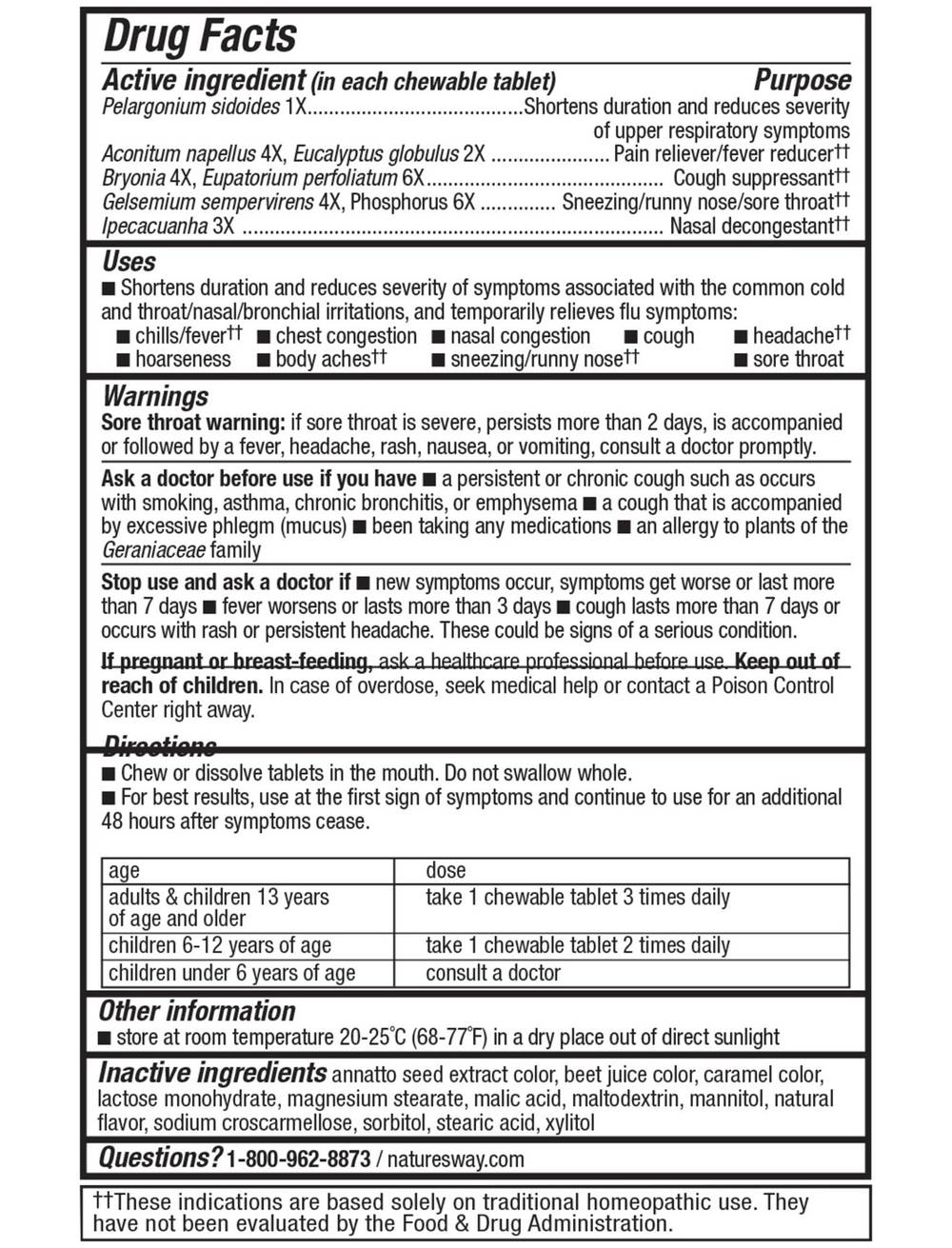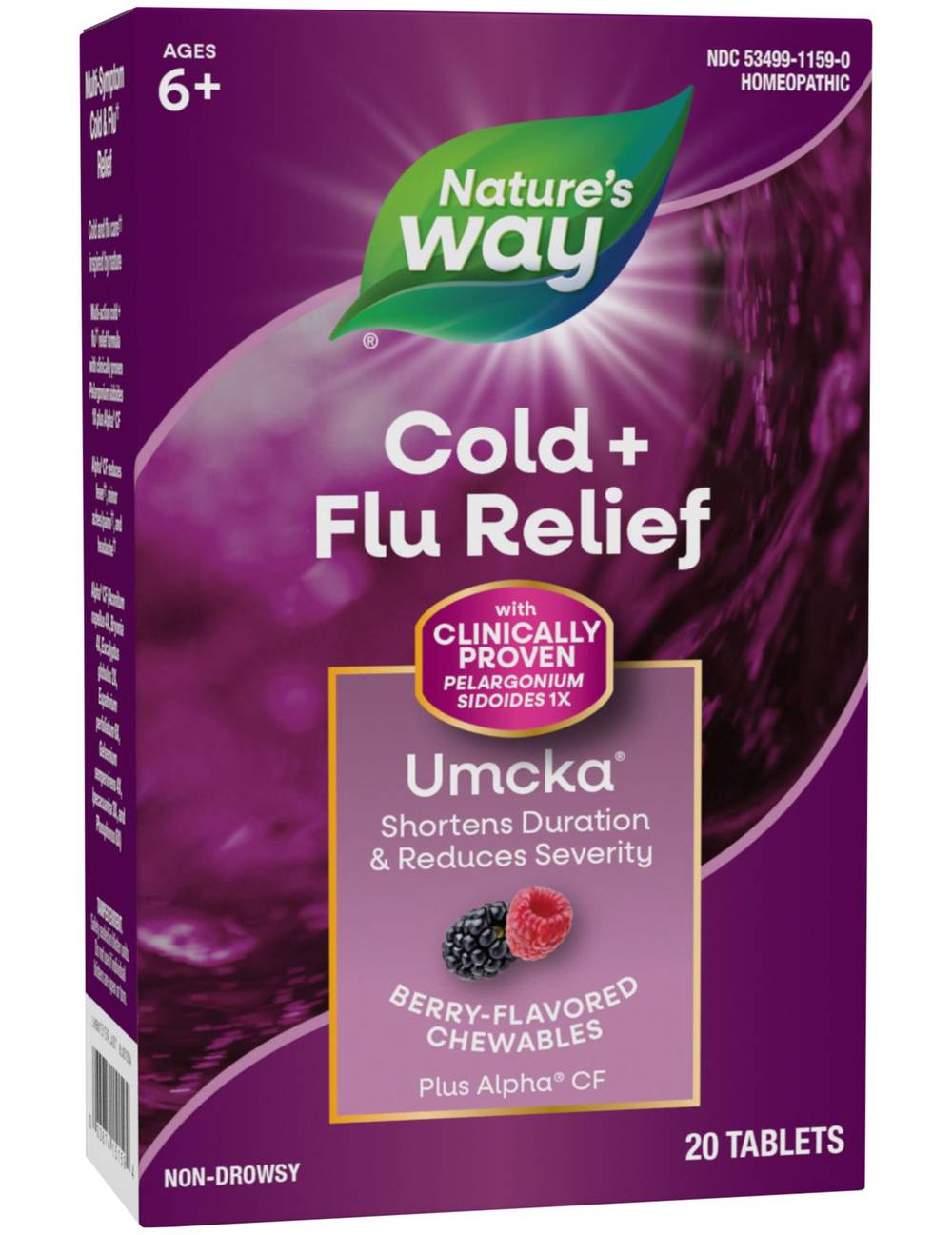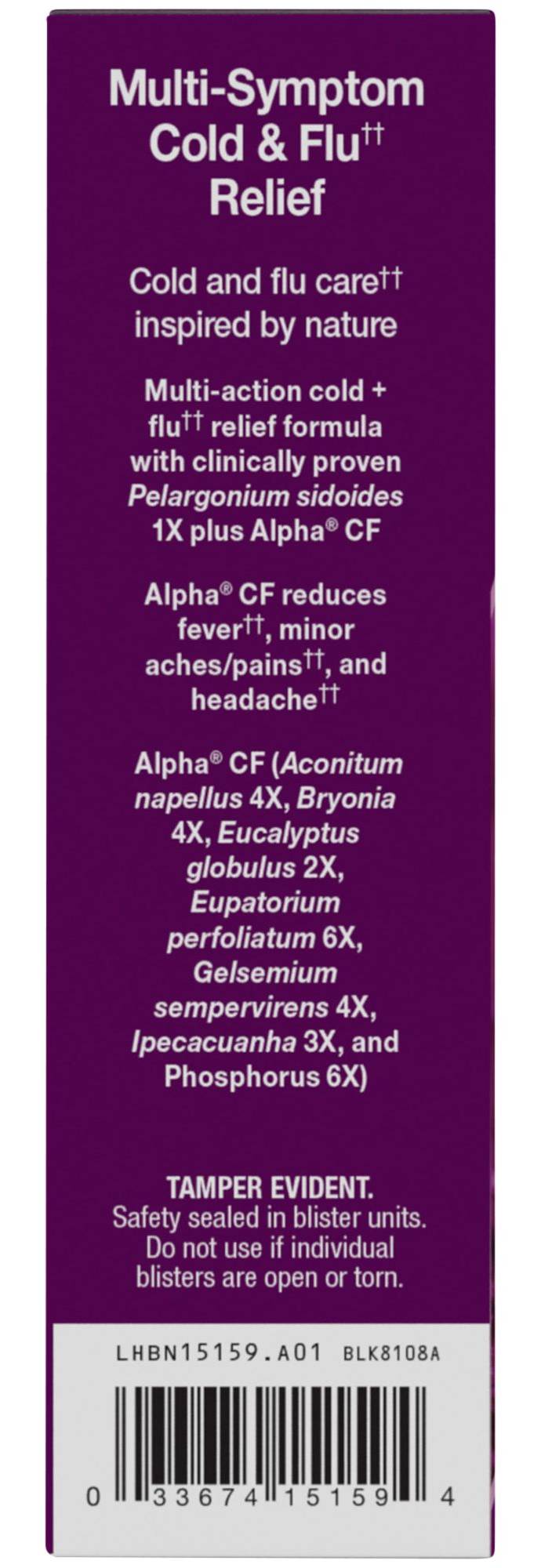 Berry FlavorHomeopathicMulti-ActionNatural ReliefAches/Pains, Congestion, Cough, Fever, Runny Nose, Sore ThroatClincally ProvenPelargonium sidoides 1x PLUS Alpha® CFChewable TabletsGreat Tasting ChewablesNon-DrowsyMedicine from Nature®Two clinically tested natural medicines combined into one complete, mutli-action cold and flu formula:UMCKA® (Pelargonium sidoides 1X) shortens duration and reduces severity of common cold, sinus, throat and bronchial symptoms.ALPHA® CF (Aconitum napellis 4X, Bryonia 4X, Eucalyptus globulus 2X, Eupatorium perfoliatum 2X, Gelsemium sempervirens 4X, Ipecacuanha 3X and Phosphorus 6X) provides multi-symptom relief of colds and flu.African Origin: UMCKA® is made from Pelargonium sidoides r