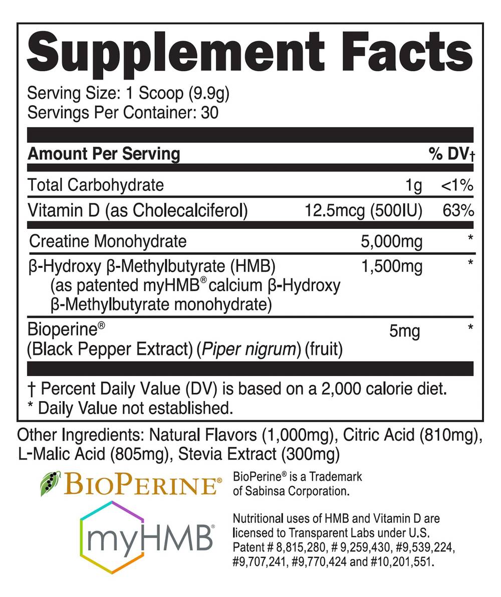 Supports muscle endurance and strength 5g of creatine and 1.5g of HMB per serving Informed Choice certified Free of GMOs, gluten, and artificial colors or sweeteners Blue Raspberry flavor Creatine HMB from Transparent Labs harnesses the synergy of creatine monohydrate with HMB to support optimal muscle growth and athletic performance. This evidence-based formula also promotes enhanced absorption and recovery with 5mg of BioPerine� and 12.5mcg of vitamin D. Frequently Asked Questions What is HMB? Beta-hydroxy-beta-methylbutyrate (HMB) is an active anabolic metabolite of leucine that helps reduce muscle damage and muscle protein breakdown. What is BioPerine? BioPerine is a black pepper extract that su