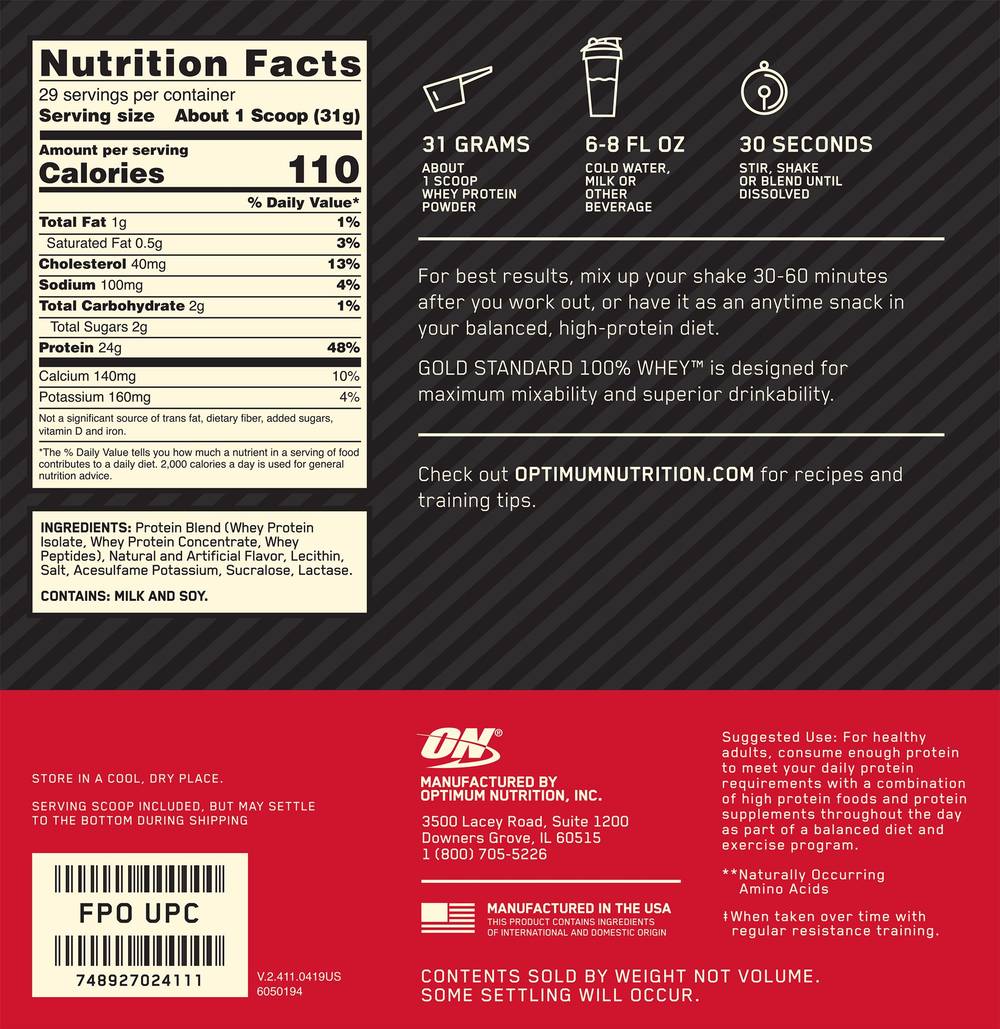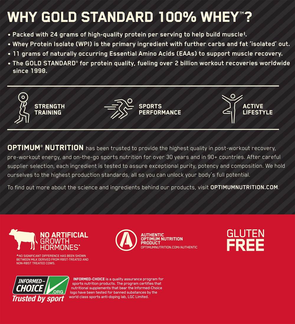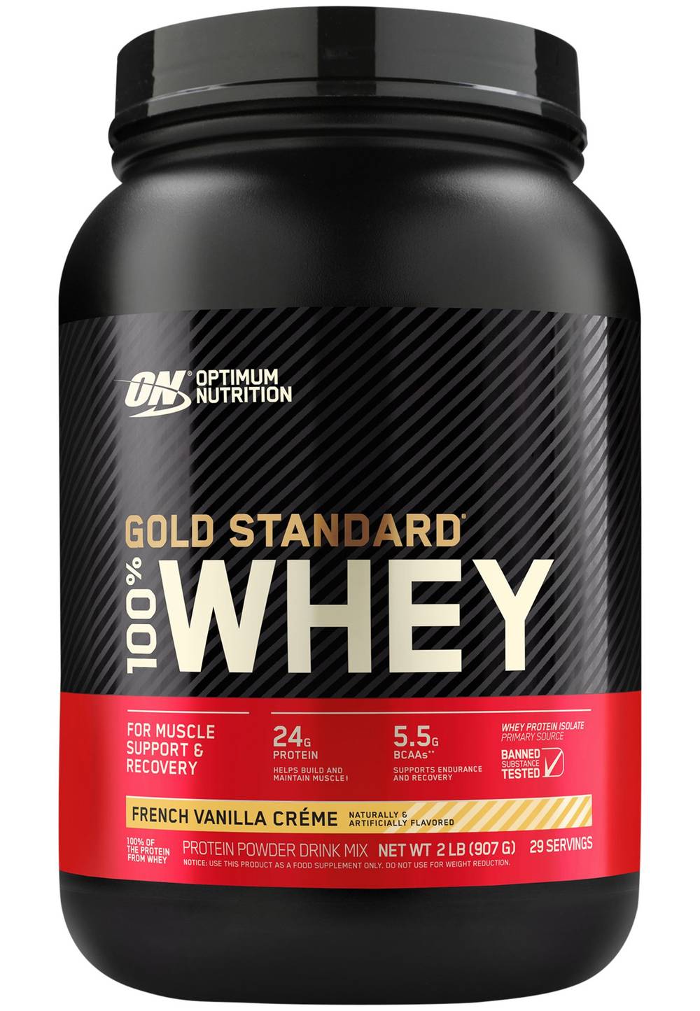 Helps build and maintain muscle Supports endurance and recovery Instantized powder for easy mixing French Vanilla Cr�me flavor GOLD STANDARD 100% WHEY by Optimum Nutrition fuels your body with 24g of high-quality whey protein derived primarily from whey protein isolate, plus 5.5g of naturally occurring BCAAs to support muscle building, maintenance, endurance, and recovery. Frequently Asked Questions What is whey protein isolate? Whey protein isolate (WPI) has the highest concentration of protein and BCAAs, while having less carbs, cholesterol, and fat compared to other whey proteins. WPI is also low in lactose and easy on your digestive tract. What are BCAAs? Branched-chain amino acids (BCAAs) include leucine, isoleucine,