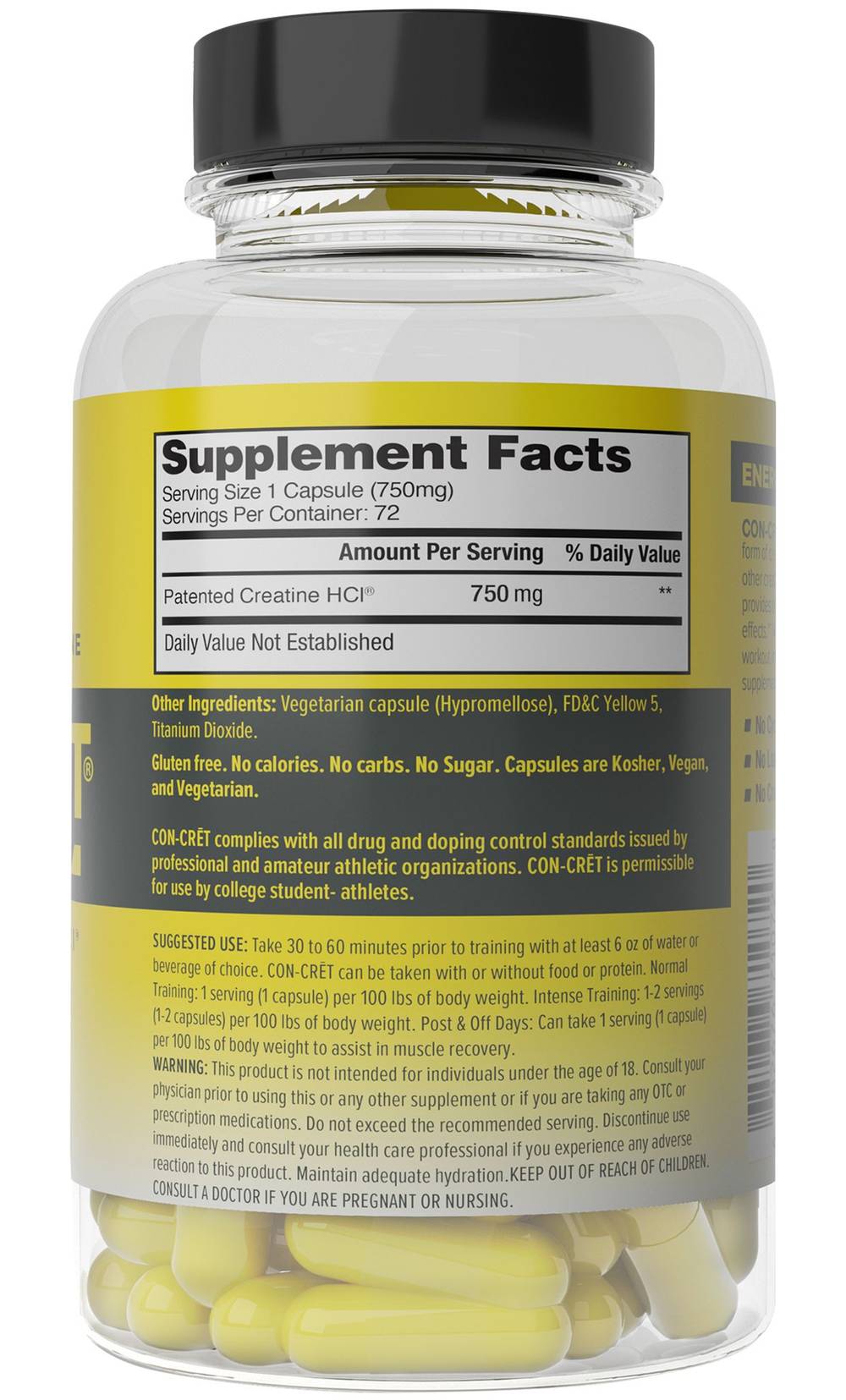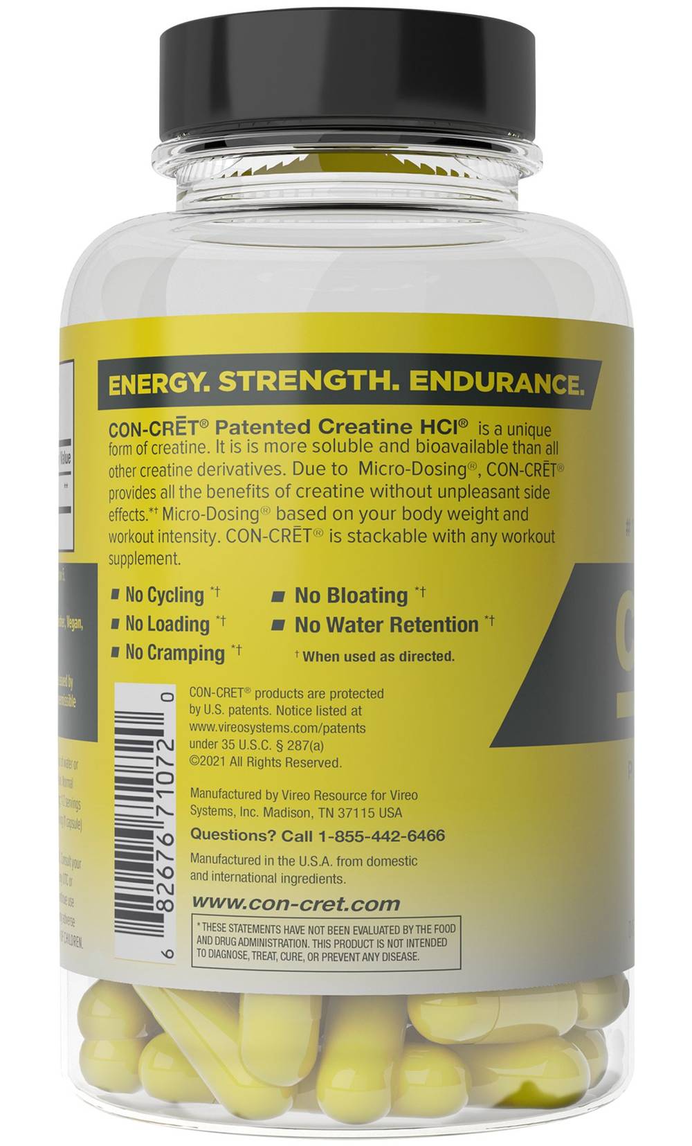 *The Original and Patented Creatine HCl *Strength, Endurance, Recovery* *No Bloating, Water Retention, Cramping, or G.I. Distress* *Pre & Post-Workout *Proven Superior Solubility (59x Increase)� *Proven Superior Plasma Uptake (70% Increase)� *Unique Creatine Micro-Dosing� Based on Body Weight *No Loading, No Cycling, No Side Effects* 1-Con-Cr�t has been repeatedly shown to have at least 59x greater aqueous solubility than creatine monohydrate when stirred for 2 minutes or less (See website for study summary. Research on file) 2-Versus creatine monohydrate (See website for study summary. Research on file) *These statements have not been evaluated by the Food and Drug Administration. This product is not intended to diagnose, treat, cure, or prevent disease.<