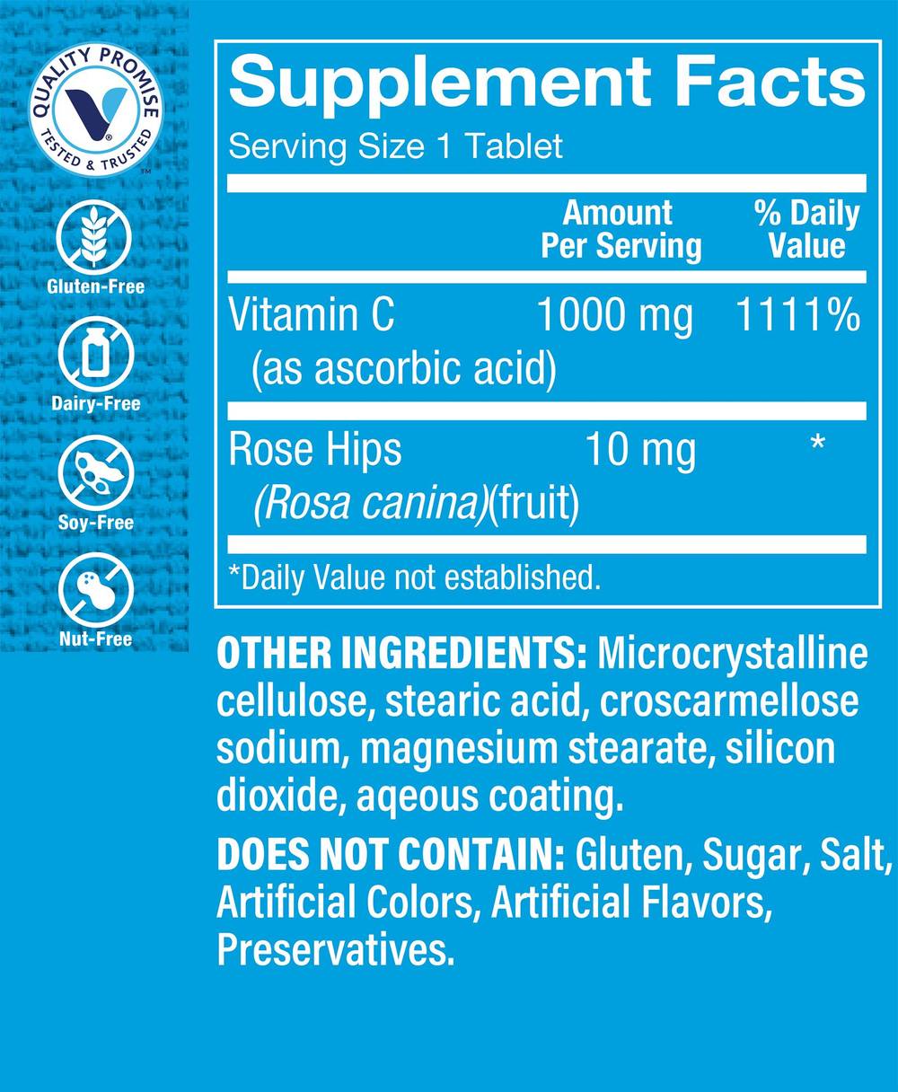 Promotes natural immunity and cardiovascular health Offers antioxidant support Contains 1,000mg of vitamin C per serving Free of gluten, dairy, nuts, salt, sugar, preservatives, and artificial colors or flavors Rose hips are well known for their vitamin C and flavonoid content. Vitamin Cotherwise known as ascorbic acidis an important antioxidant that aids our immune and cardiovascular systems by defending cells against damaging free radicals, promoting collagen formation, and boosting iron absorption. Featuring a blend of both ascorbic acid and rose hips, These The Vitamin Shoppe� brand tablets are your convenient source of immune and cardiovascular health-supporting goodness.