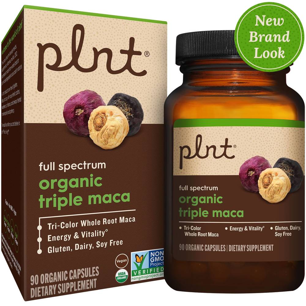 Supports energy and vitality Certified USDA Organic and Non-GMO Project Verified Vegan and free of gluten, dairy, and soy Maca is an adaptogenic herb found in the high Andes mountainsbut you dont need to go all the way there for an all-natural boost. Organic Triple Maca combines yellow maca with antioxidant-packed red maca, plus rare black maca to promote energy and vitality. All plnt� products are made from whole food or plant-based ingredients sourced in nature, contain zero synthetic colors, sweeteners, or flavors, and are always tested to ensure purity and potency. Frequently Asked Questions Whats an adaptogen? An adaptogen is a substance used to help the body adapt to stress. Whats the difference between