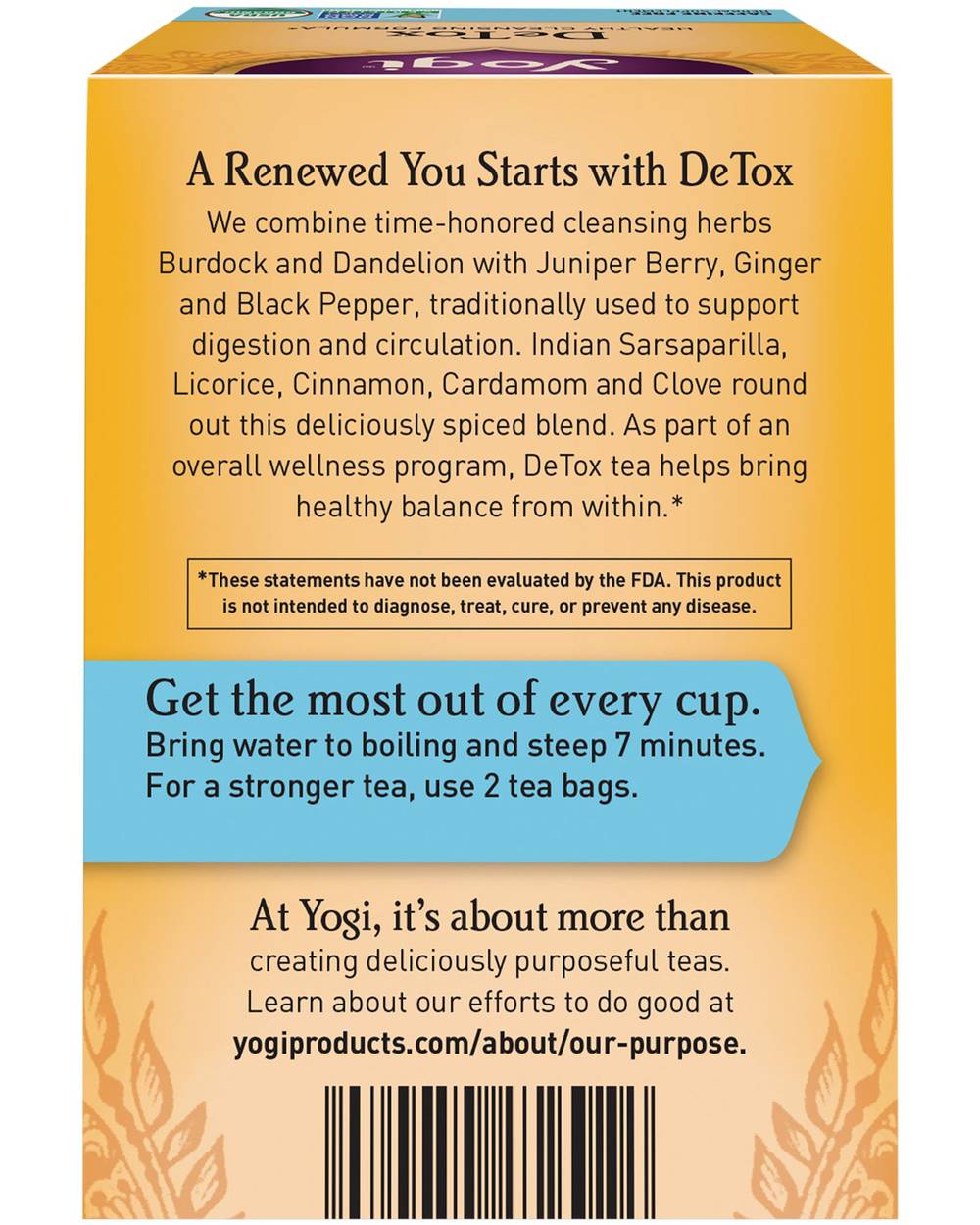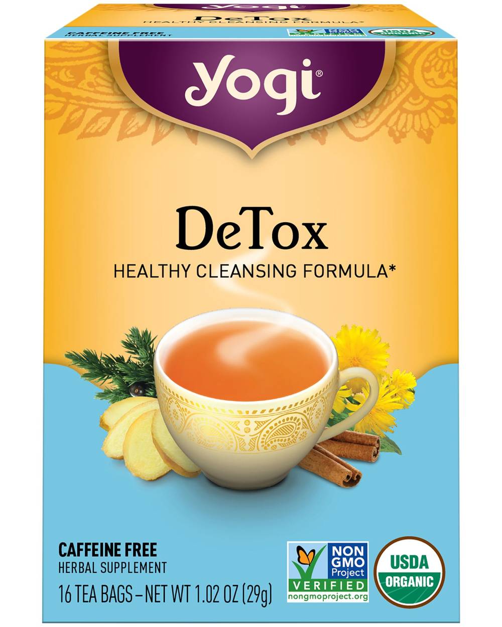 As everyday impurities find their way into our bodies, we may be left feeling tired or out of balance. Yogi DeTox tea combines time-honored cleansing herbs Burdock and Dandelion with Juniper Berry and an Ayurvedic blend called "trikatu" (Ginger, Black Pepper, and Long Pepper); traditionally used to support digestion and circulation. Indian Sarsaparilla, Licorice, Cinnamon, Cardamom, and Clove round out this delicious blend for a perfectly spiced tea. As part of an overall wellness program, Yogi DeTox tea helps bring healthy balance from within. Packaging: Reusable
