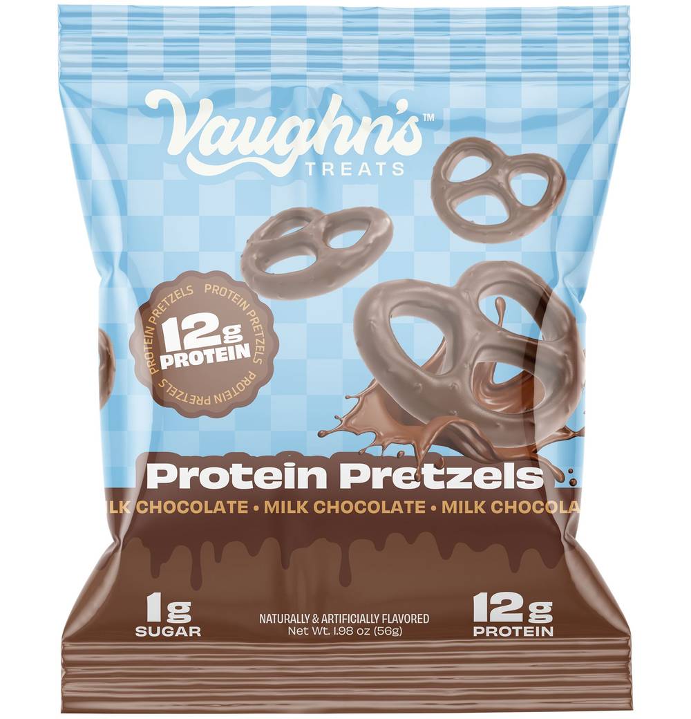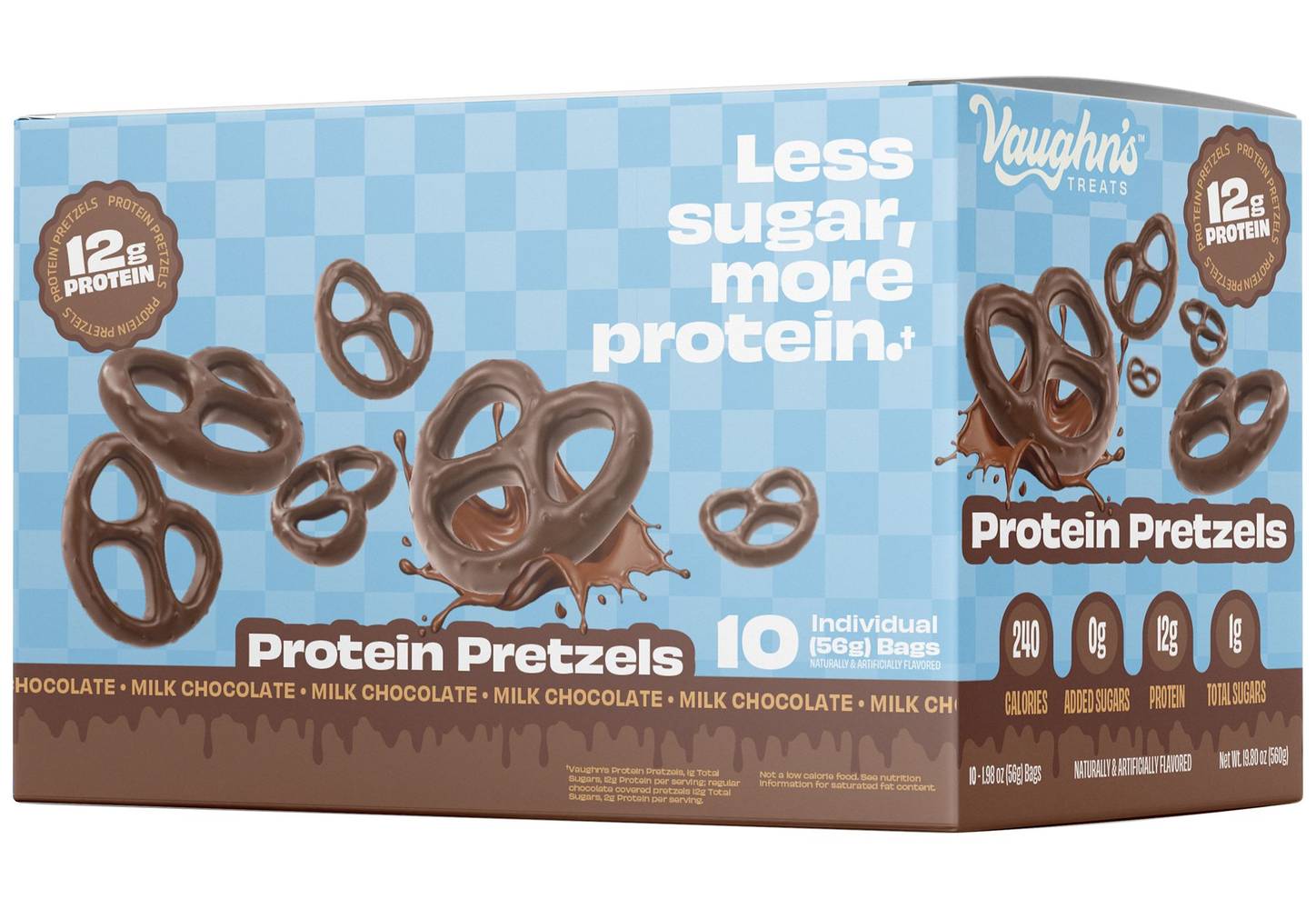 Less sugar, more protein. Vaughns Protein Pretzels, 1g Total Sugars, 12g Protein per serving; regular chocolate covered pretzels 12g Total Sugars, 2g Protein per serving.