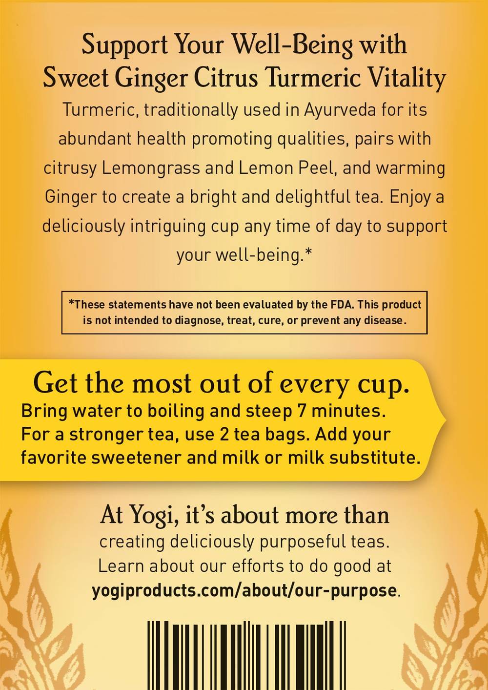 Support your well-being with sweet ginger citrus turmeric Vitality turmeric, traditionally used in ayurveda for its abundant health promoting qualities, pairs with citrusy lemongrass and lemon Peel, and warming ginger to create a bright and delightful tea. Enjoy a deliciously intriguing cup any time of day to support your well-being. Packaging: Reusable