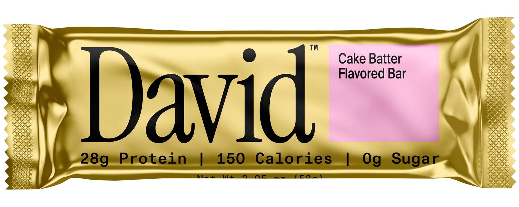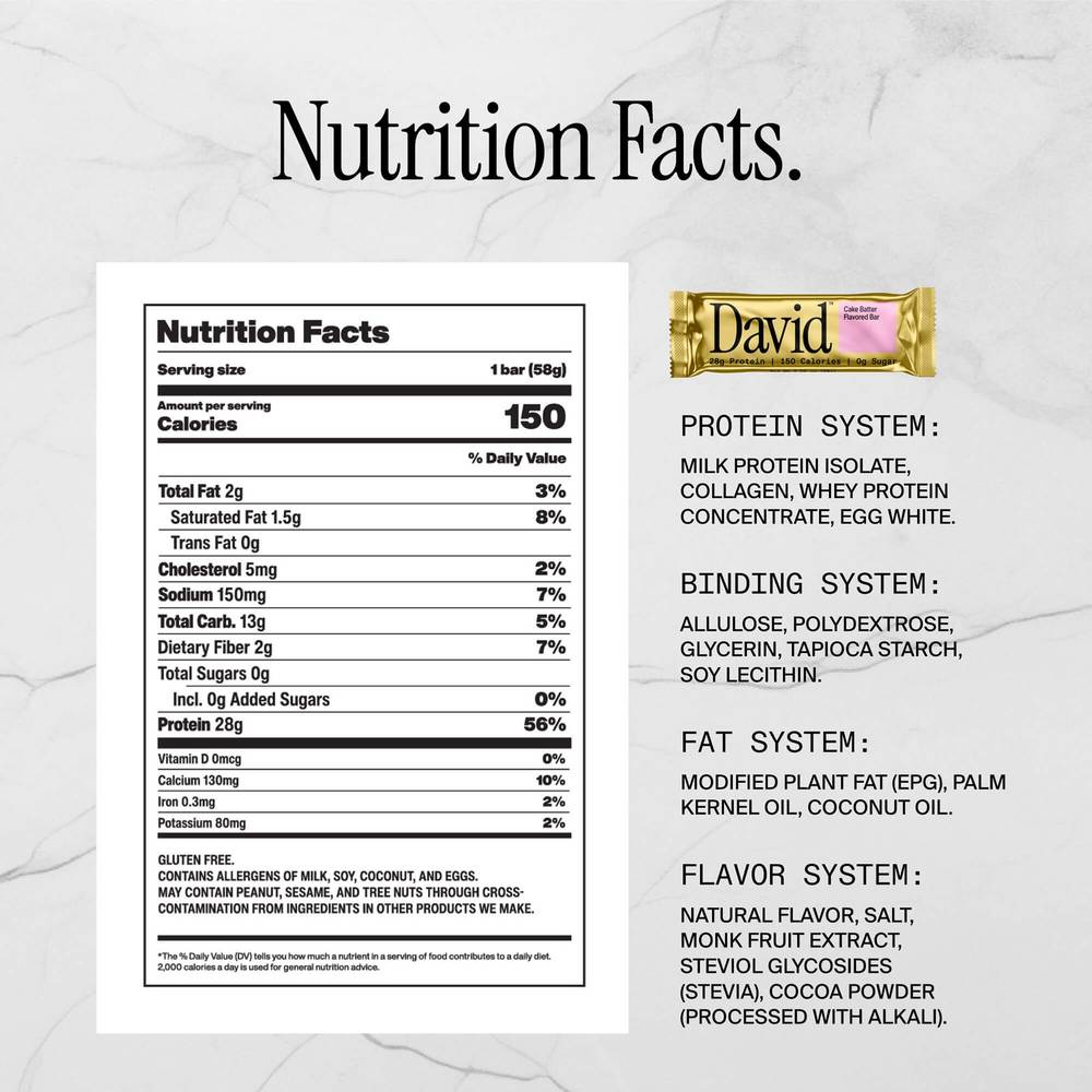 28g of protein, 150 calories, and 0g of sugar Optimal amino acid profile for muscle building and beauty Cake Batter flavor with sweet white chocolate chunks and vanilla cookie crisps A David Protein Bar is a delicious work of art, with 75% of its calories coming from protein (50% higher than any other bar)! It combines milk protein isolate, collagen, whey protein concentrate, and egg white to create the best amino acid profile for muscle building and optimal skin, hair, and nail health.
