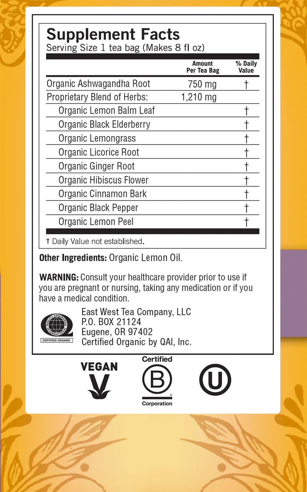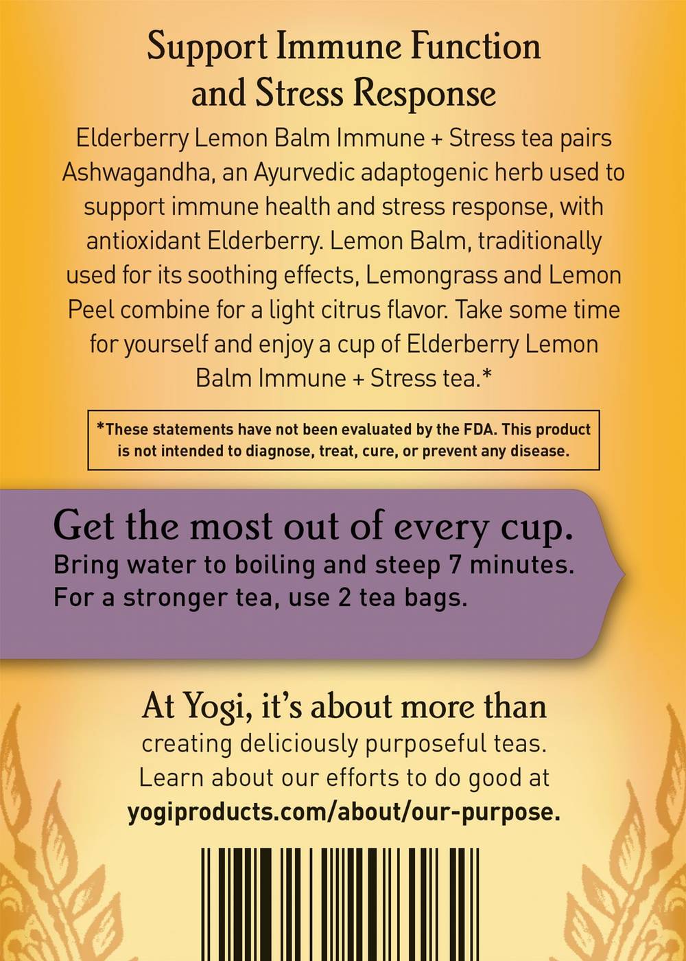 Support immune function and stress response elderberry lemon balm immune + stress tea pairs ashwagandha, an ayurvedic adaptogenic herb used to support immune health and stress response, with antioxidant elderberry. Lemon Balm, traditionally used for its soothing effects, Lemongrass and Lemon Peel combine for a light citrus flavor. Take some time for yourself and enjoy a cup of Elderberry Lemon Balm Immune + Stress tea. Packaging: Reusable
