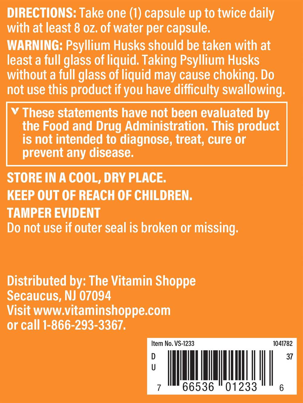 Provides digestive supportPromotes regularitySuitable for everyday wellness seekersFree of gluten, dairy, soy, nuts, and salt Psyllium is a soluble fiber derived from the seed husks of the Plantago ovata plant, otherwise known as ispaghula. Commonly used as a gentle bulk-forming laxative, psyllium supports healthy digestion and regularity. To keep things running smoothly, take one The Vitamin Shoppe® brand Psyllium Husks capsule up to two times per day with a tall glass of water. Frequently Asked Questions What is a bulk-forming laxative?Instead of being digested, bulk-forming laxatives absorb liquid and swell in the intestines to form soft and bulky stool that stimulates your bowels.
