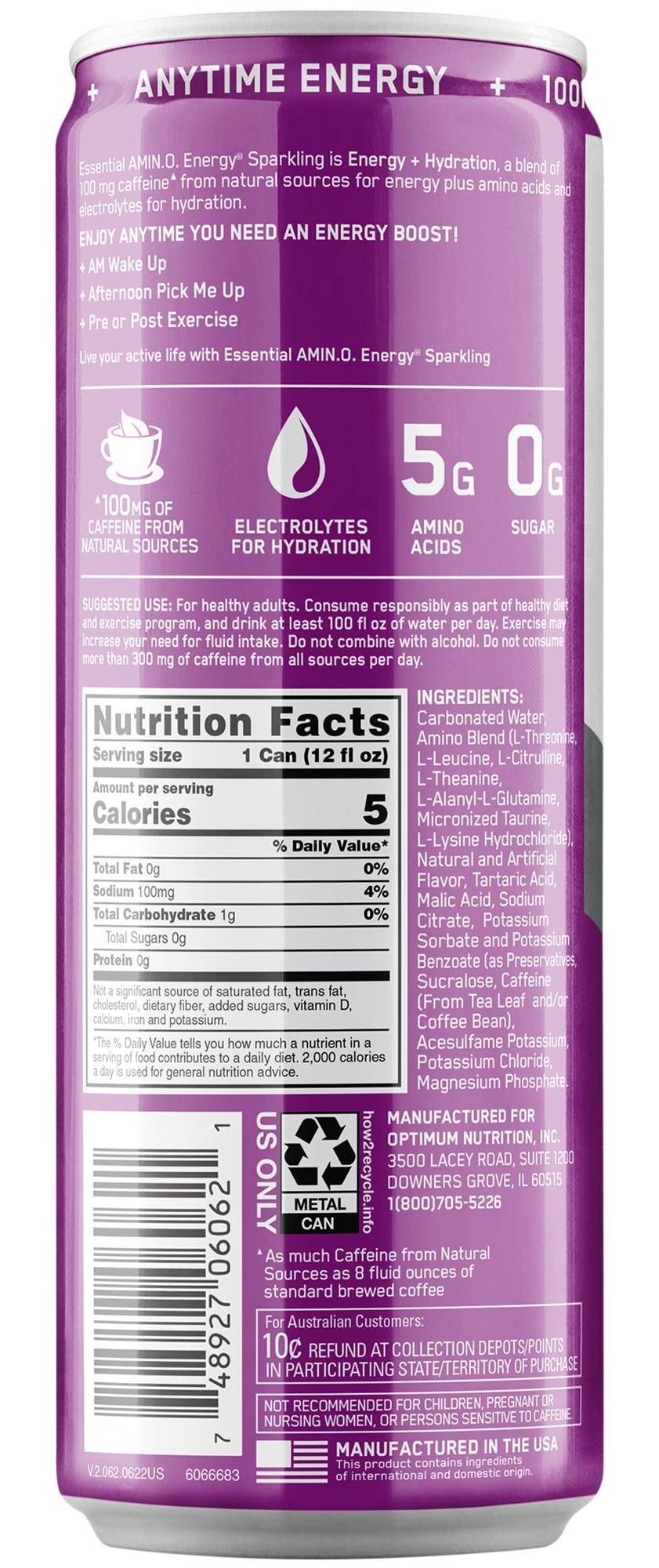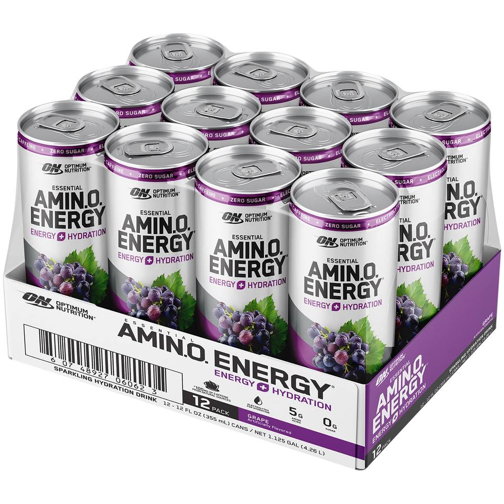 Essential amino acid delivery Electrolyte support Supports energy, focus, and muscle recovery Caffeine derived from natural sources Grape flavor Looking for the perfect pre-workout boost or anytime pick-me-up? ESSENTIAL AMIN.O. ENERGY + ELECTROLYTES by Optimum Nutrition supports muscle recovery before, during, and after exercise with 5g of micronized free-form amino acids. BONUS: its got 100mg of caffeine for energy and electrolytes to help replenish whats lost with sweat. Frequently Asked Questions What are essential amino acids? Essential amino acids (EAAs) are amino acids that your body cant produce enough of on its own, including leucine, isoleucine, valine, histidine, lysine, methionine, phenylalanine, threonine, and tryptophan. EAAs • Pack size: 12 • Packaging: Reusable