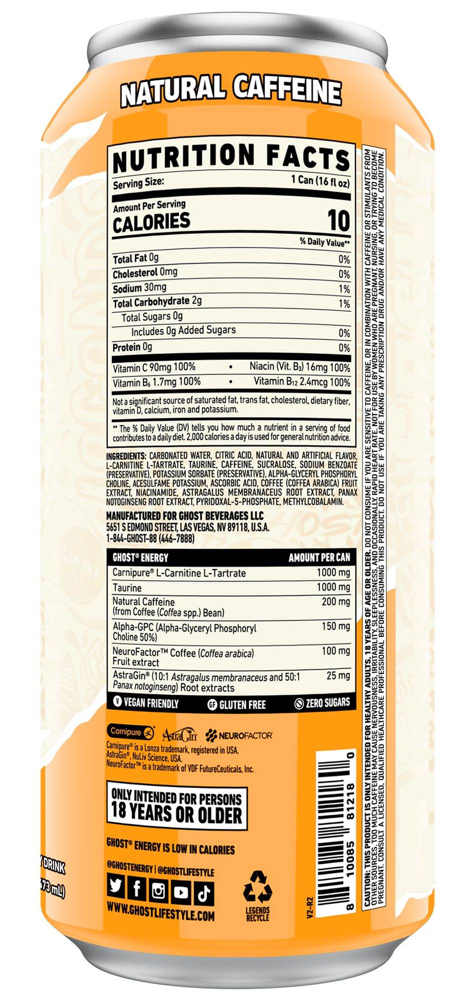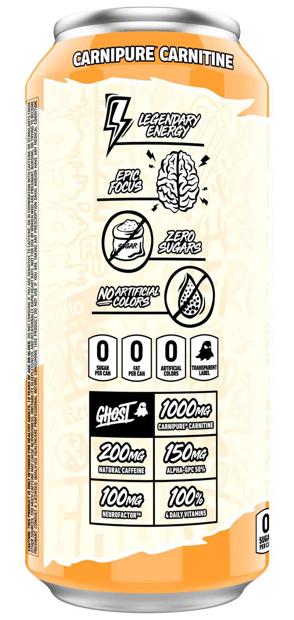 The powerful GHOST formula features:1000mg Acetyl-L-Carnitine200mg Natural Caffeine150mg Alpha-GPC 50%100mg Neurofactor100% 7 Daily B VitaminsLegendary EnergyEpic FocusZero SugarsNo Artificial Colors Packaging: Reusable