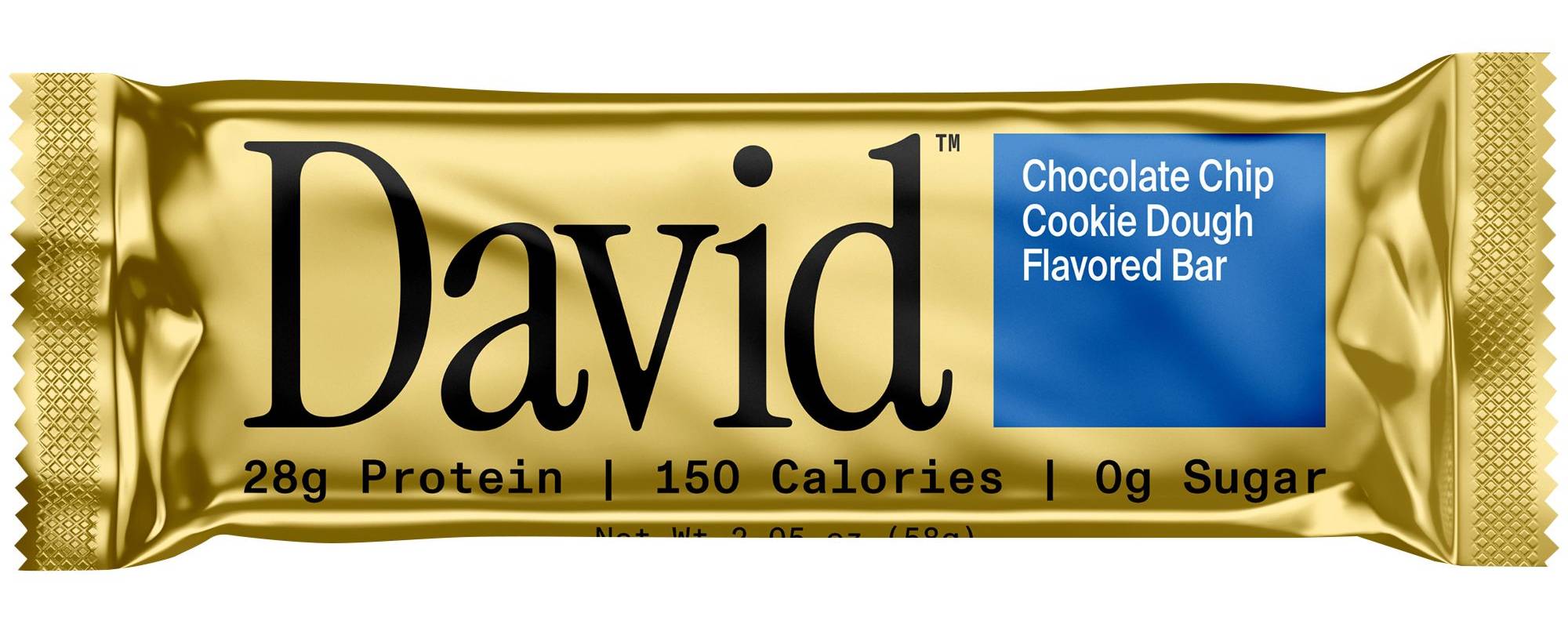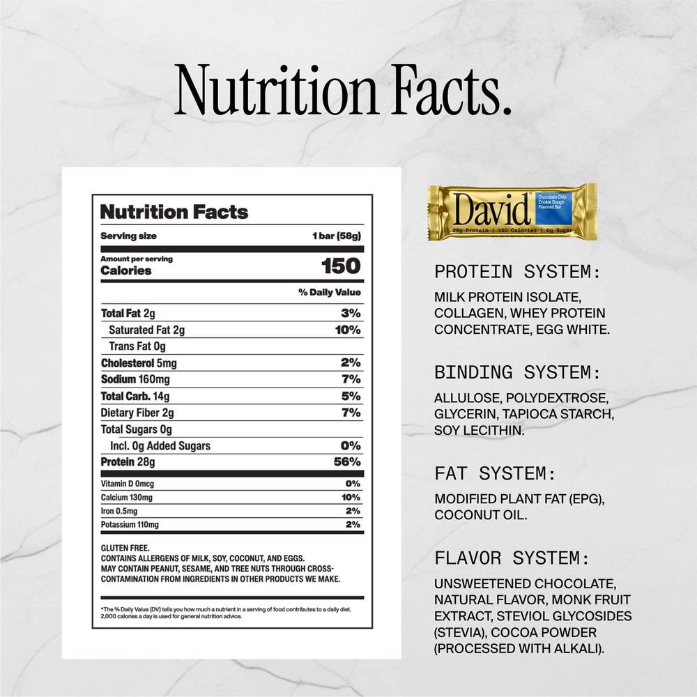28g of protein, 150 calories, and 0g of sugar Optimal amino acid profile for muscle building and beauty Chocolate Chip Cookie Dough flavor with rich chocolate chunks and vanilla cookie crisps A David Protein Bar is a delicious work of art, with 75% of its calories coming from protein (50% higher than any other bar)! It combines milk protein isolate, collagen, whey protein concentrate, and egg white to create the best amino acid profile for muscle building and optimal skin, hair, and nail health.